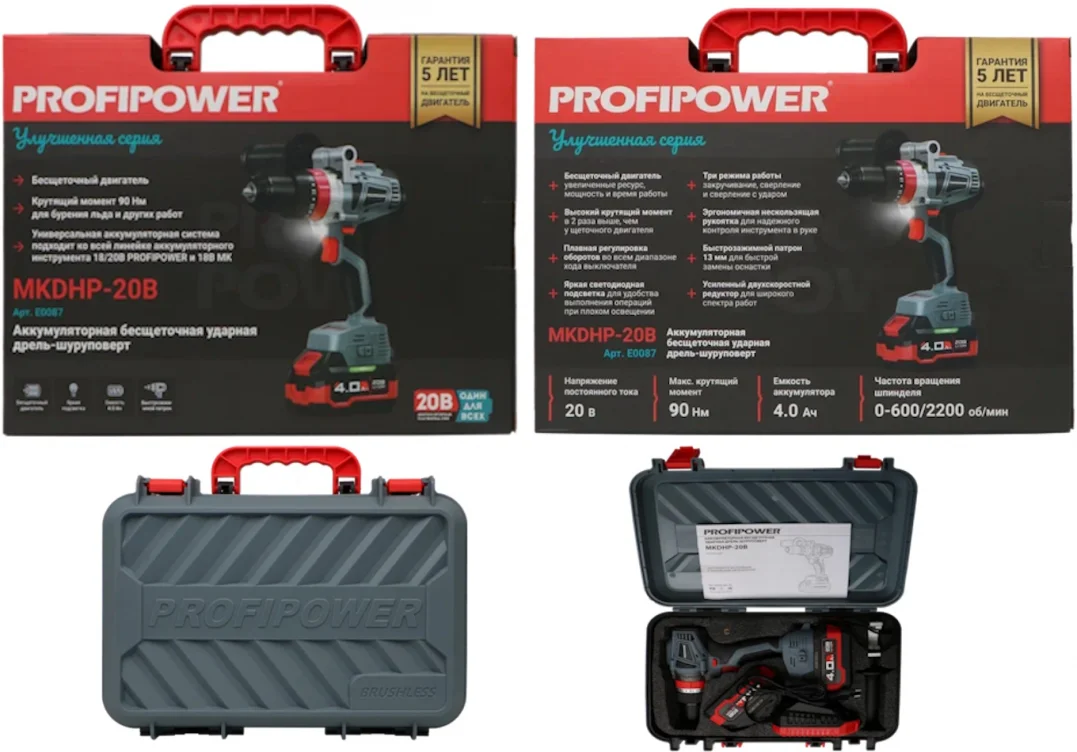 - Аккумуляторная ударная дрель-шуруповерт PROFIPOWER MKDHP-20В, артикул E0087M1 с максимальным крутящим моментом 90 Нм предназначена для строительных и ремонтых работ, сверления древесины, металлов, керамики и синтетических материалов, для завинчивания или откручивания винтов, нарезания резьбы.