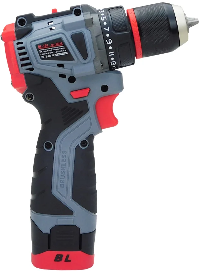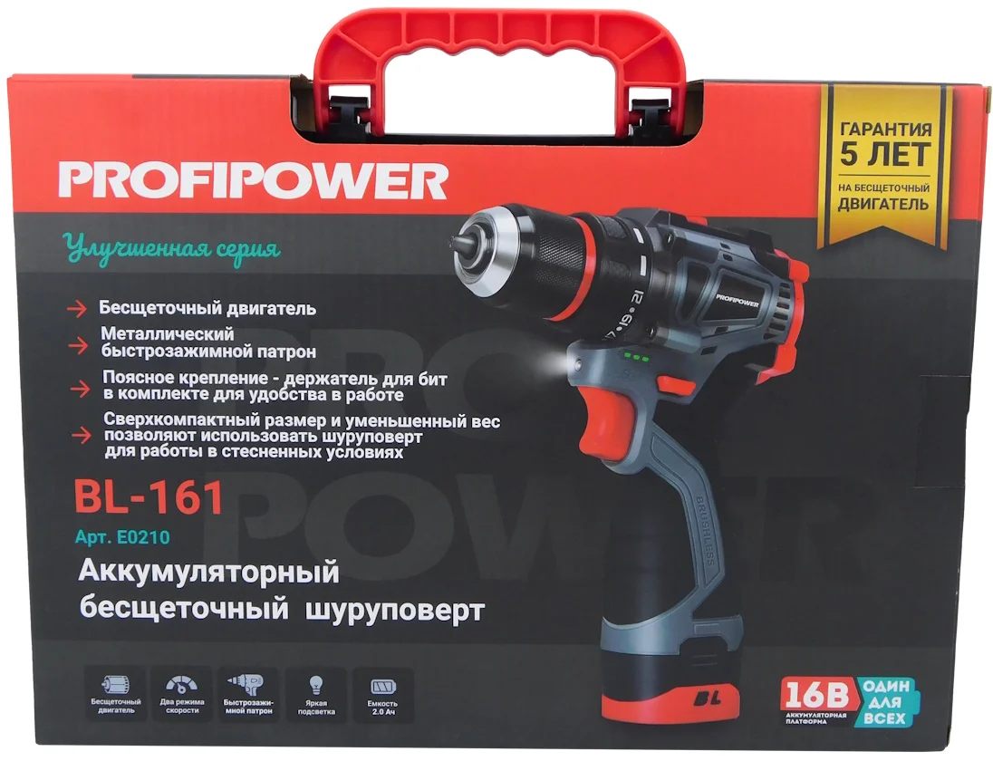 Аккумуляторный бесщеточный шуруповерт PROFIPOWER BL-161(16В,40Нм,Li-ion 2шт,2.0Ач,поясная клипса, бита-магнит, 2 скорости,0.8-10мм,З/У,в кейсе), E0210