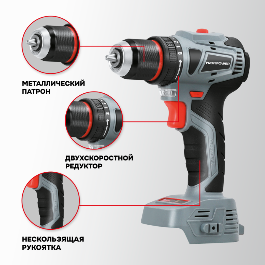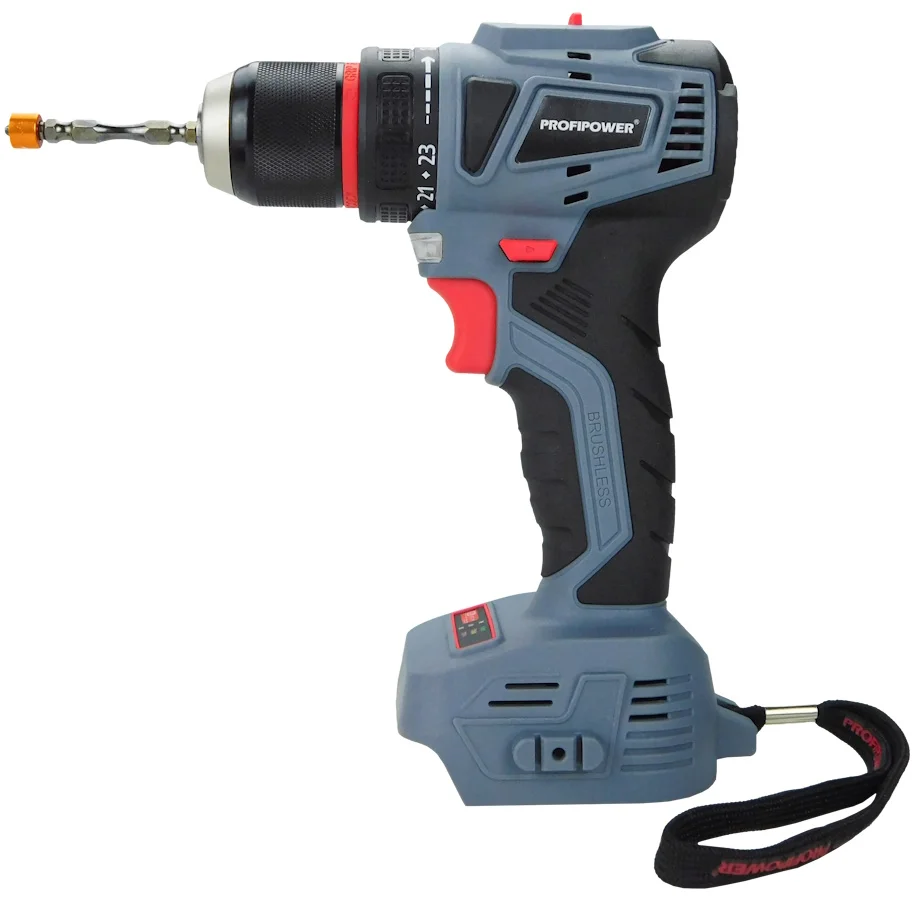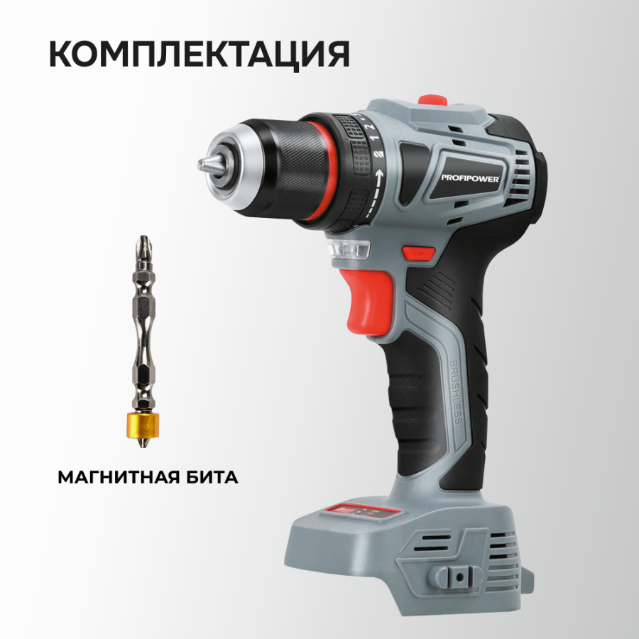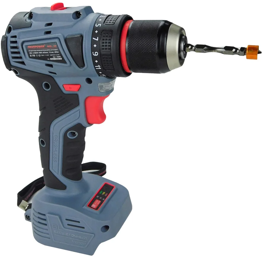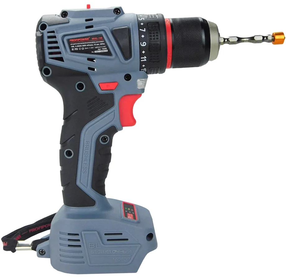 - Универсальная модель шуруповерта PROFIPOWER MKBL-18B, без АКБ артикул E0159 с бесщеточным двигателем для решения любых задач сверления и закручивания.
