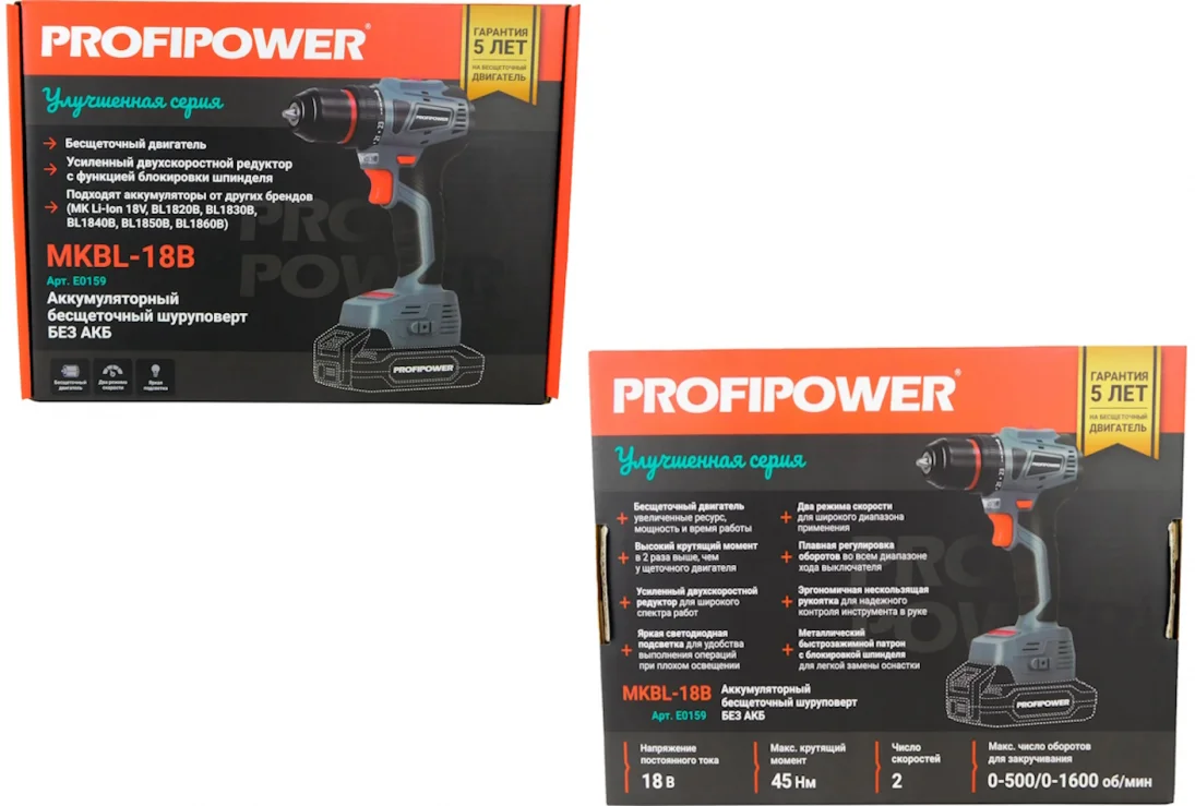 Аккумуляторный бесщеточный шуруповерт PROFIPOWER MKBL-18B (18В, без АКБ, 45Нм, 2 скорости, 0,8-10мм, в коробке), E0159