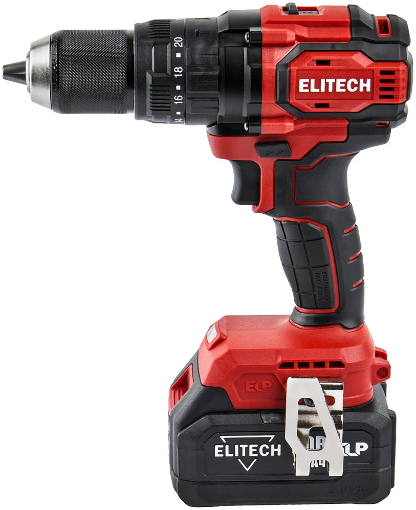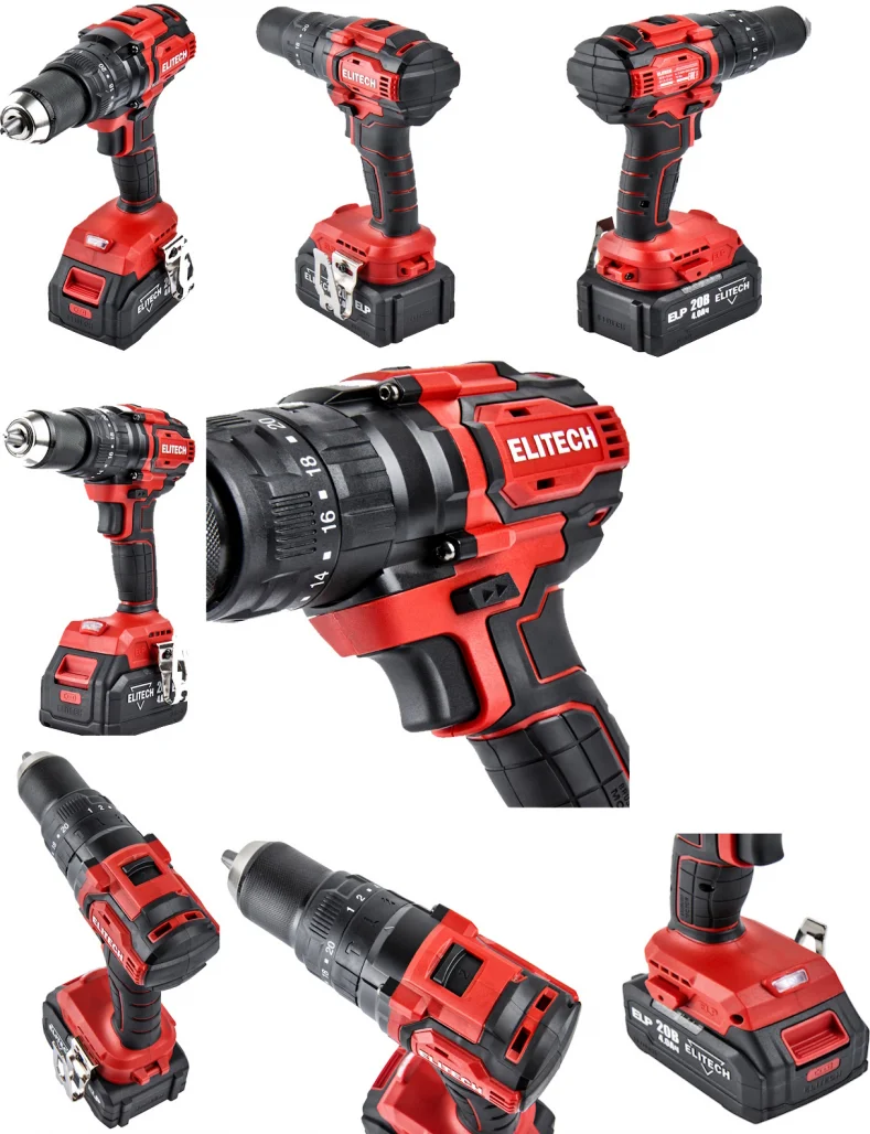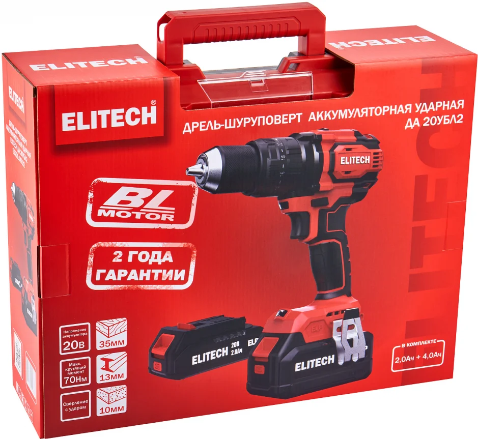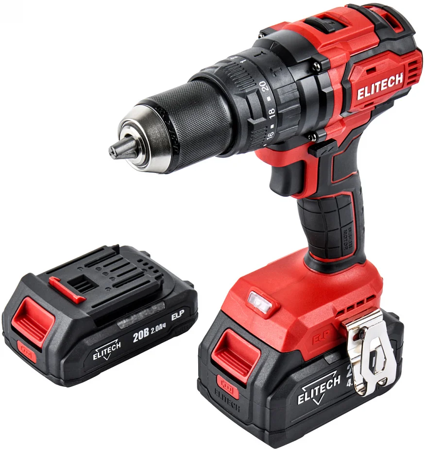 - Аккумуляторная ударная дрель-шуруповерт Elitech ДА 20УБЛ2 (E2201.047.02), артикул 205680 с Li-Ion ELP аккумуляторами разной емкости (2 и 4 Ач.) максимальным крутящим моментом 70 Нм предназначена для сверления отверстий в черных и цветных металлах, дереве и производных материалах на его основе (фанера, ДСП, OSB, МДФ и подобные), различных видов пластика, сверления с ударом в кирпиче, камне и для установки крепежа.