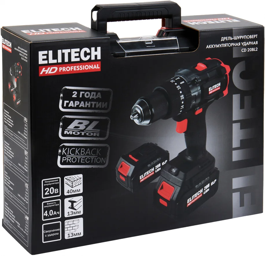 Дрель ударная аккумуляторная Elitech HD CD 20BL2 (E2201.042.02), 205728.