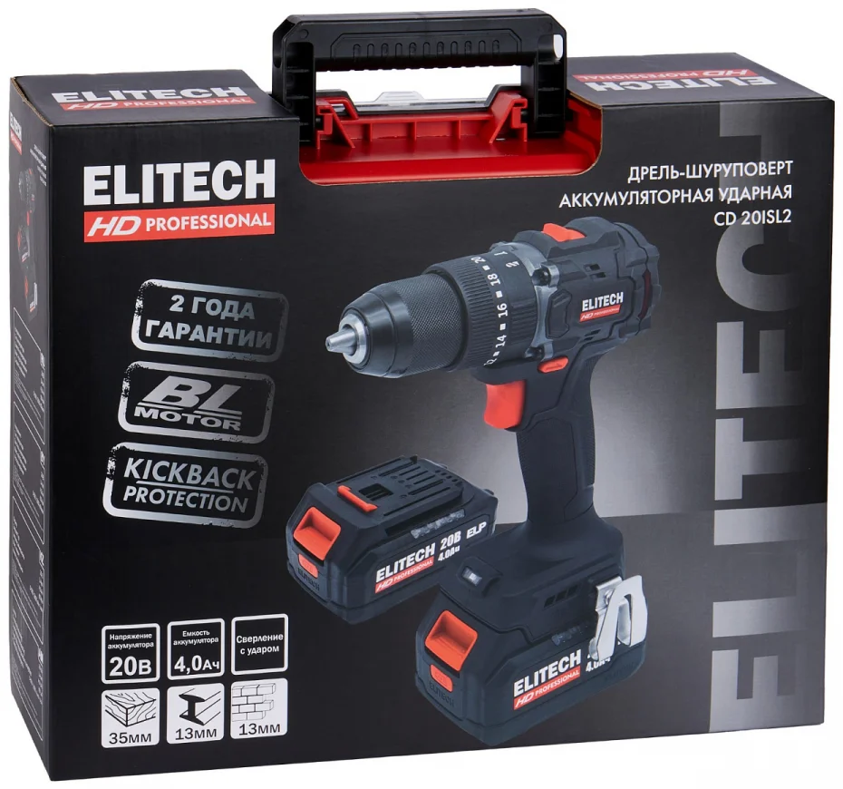 - Аккумуляторная ударная дрель-шуруповерт Elitech CD 20ISL2 (E2201.041.02), артикул 205723 с максимальным крутящим моментом 65 Нм предназначена для сверления отверстий в черных и цветных металлах, дереве и производных материалах на его основе (фанера, ДСП, OSB, МДФ и подобные), различных видов пластика, сверления с ударом в кирпиче, камне и для установки крепежа.
