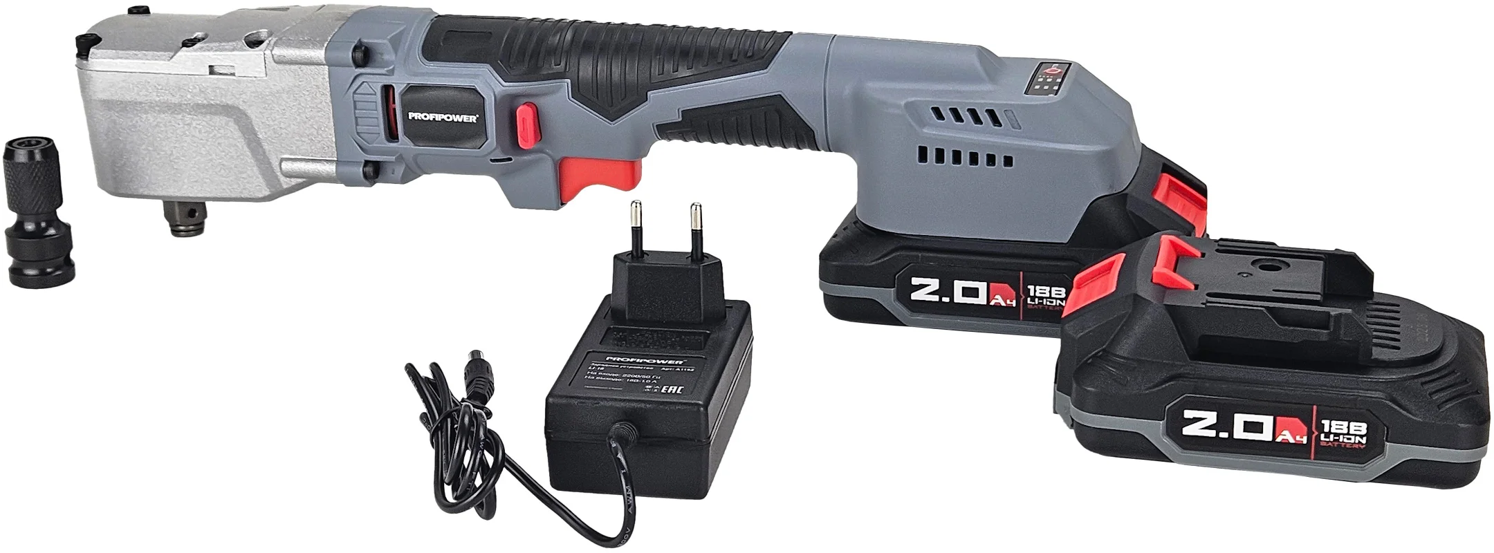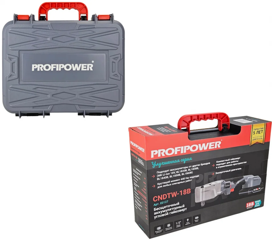 - Аккумуляторный ударный угловой гайковерт PROFIPOWER CNDTW-18B, артикул E0127 подходит для завинчивания и откручивания крупного крепежа (винтов, шпилек, нагелей, «глухарей», крупных саморезов), мелких гаек и болтов.