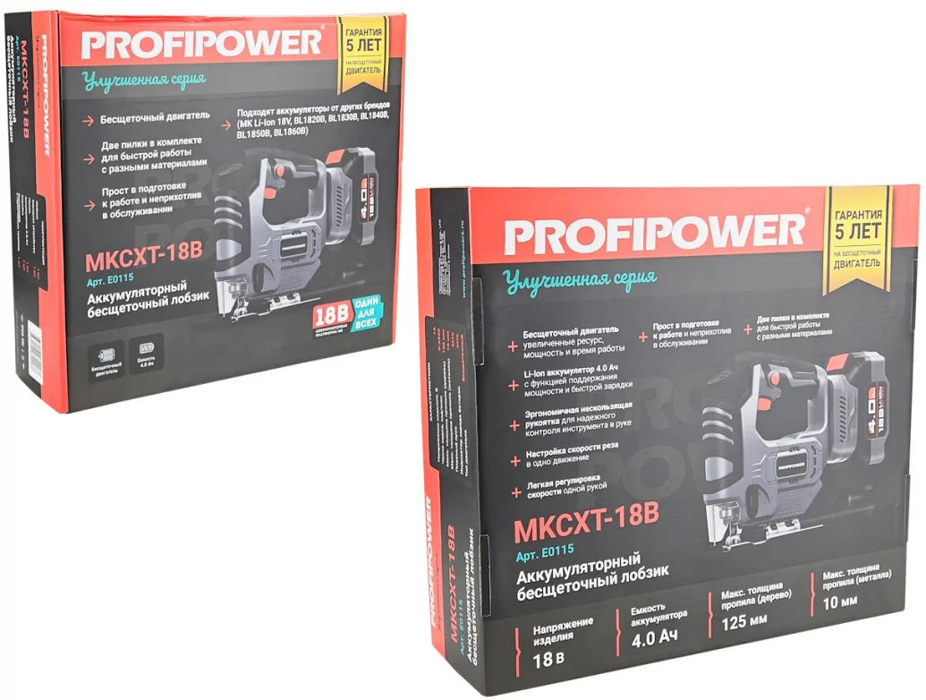 - Аккумуляторный бесщеточный лобзик PROFIPOWER MKCXT-18B артикул E0115 предназначен для фигурного распила листовых материалов и точного вырезания по дереву, металлу и пластику.
