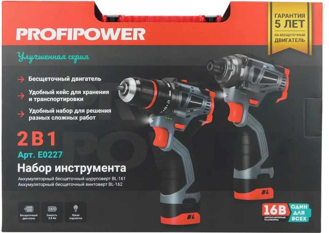 - Универсальный набор аккумуляторного инструмента 2в1 ProfiSet 2A16 артикул E0227 c бесщеточным двигателем, который значительно улучшает характеристики устройства по сравнению с щеточной моделью.