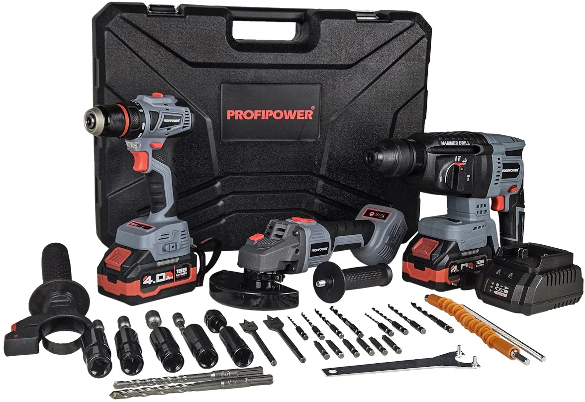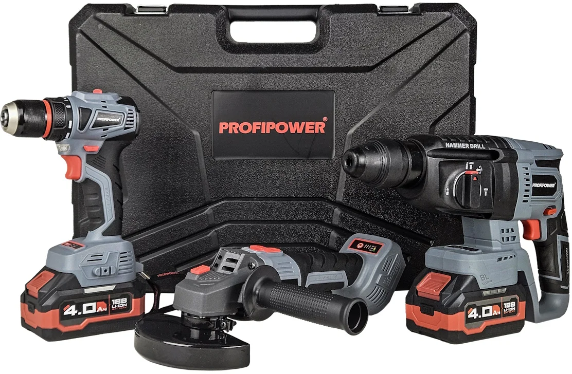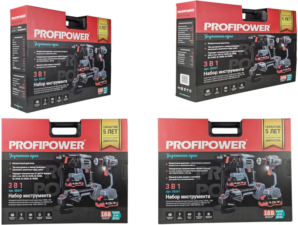 - Универсальный набор аккумуляторного инструмента 3в1 PROFIPOWER ProfiSet-3E18 артикул E0247 c бесщеточными двигателями, которые значительно улучшают характеристики устройств по сравнению с щеточными моделями.