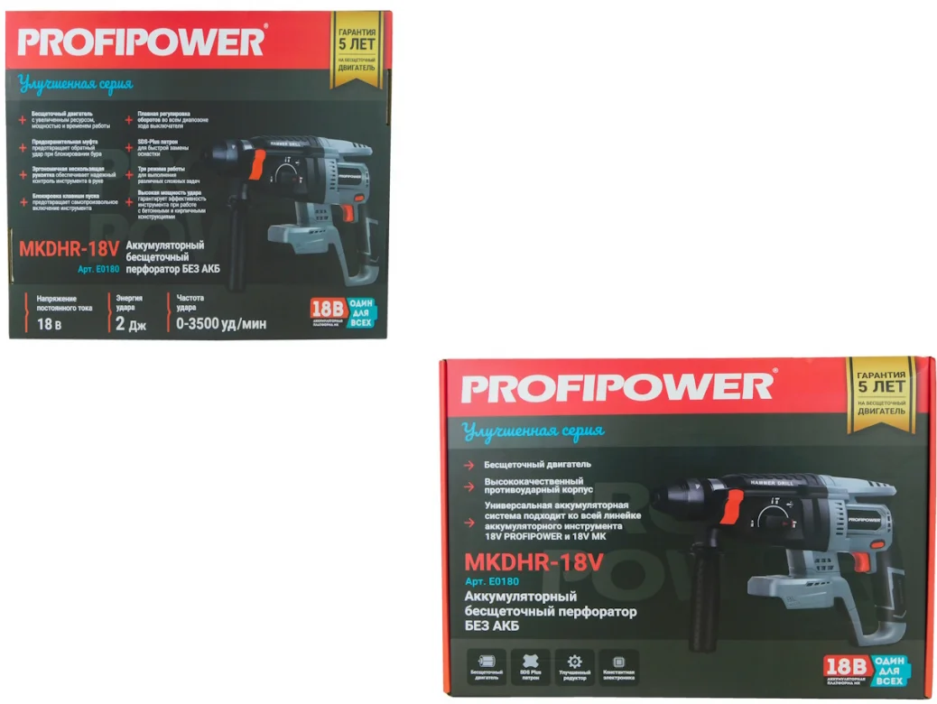 - Аккумуляторный перфоратор PROFIPOWER MKDHR-18V артикул E0180 — 18 вольт отличается мощным ударом и удобством в использовании. Модель подходит для сверления в дереве, пластмассе, металле, сверления с ударом и долбления в бетоне, штукатурке, кирпичной кладке, керамике.