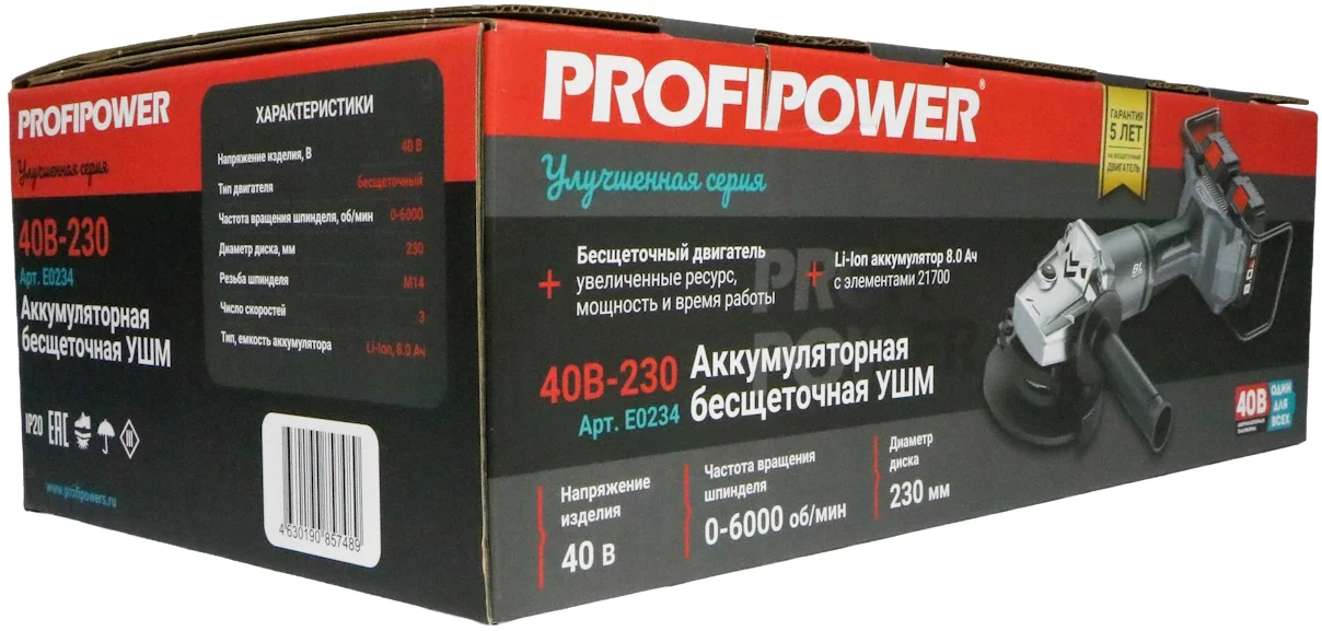 Аккумуляторная бесщеточная УШМ PROFIPOWER (Серия 40B), 40B-230 (40В, 230мм, Li-ion-2шт, 8.0Ач, 0-6000об/мин, З/У), E0234