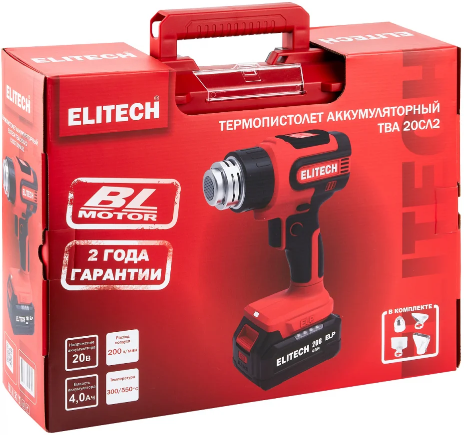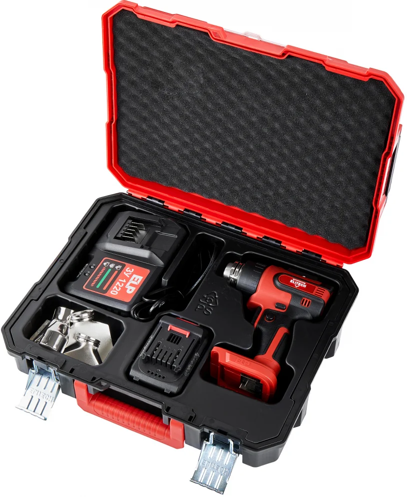- Аккумуляторный пистолет горячего воздуха (технический фен) Elitech ТВА 20СЛ2 (E2207.009.01), артикул 205705 используется при следующих видах работ: снятие лакокрасочных покрытий с деревянных поверхностей, пайка, сварка и формовка пластика, осаживание термоусадочных материалов, ускорение процессов склеивания, пайка мягким припоем и лужение, сушка и размораживание, сварка и резка листовых и рулонных материалов (линолеума и подобных).