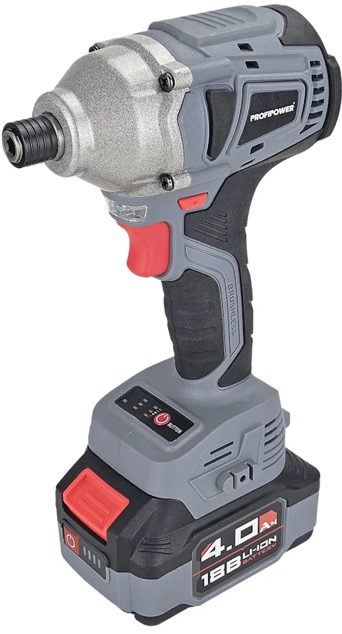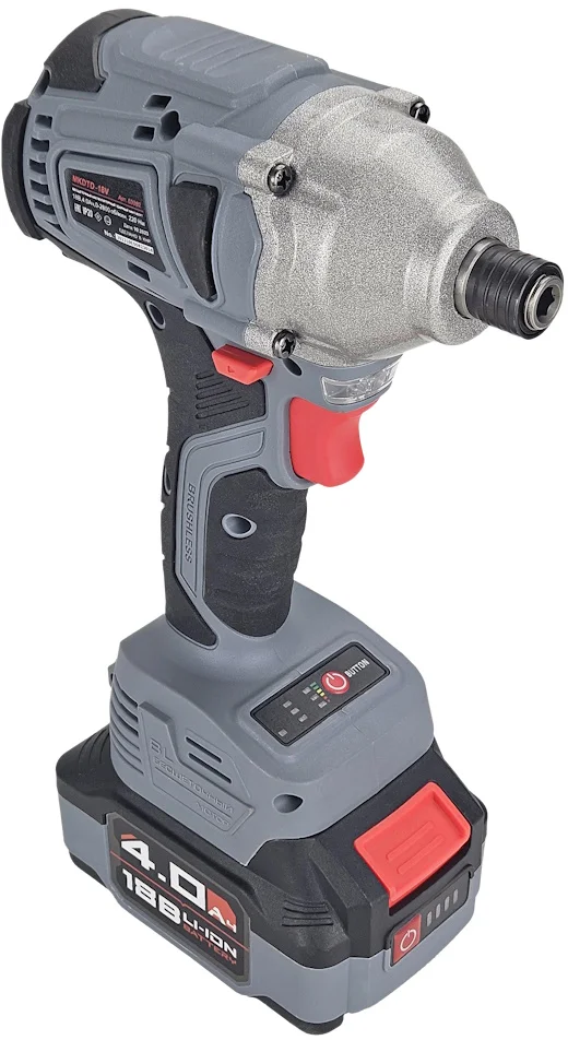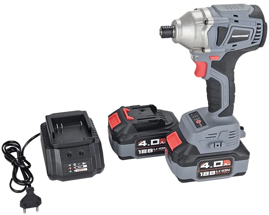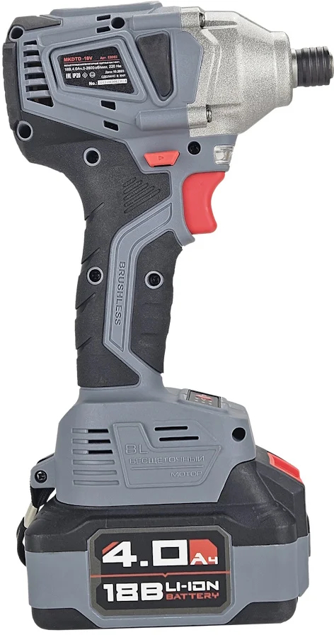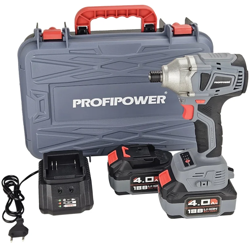 - Винтовёрт аккумуляторный ударный PROFIPOWER MKDTD-18V артикул E0082 с крутящим моментом 220 Нм., бесщеточным двигателем и с двумя Li-ion аккумуляторами 18 В., емкостью 4 А*ч предназначен для работы с резьбовым крепежом (нагели, "глухари", саморезы крупных размеров, винты, болты и гайки).