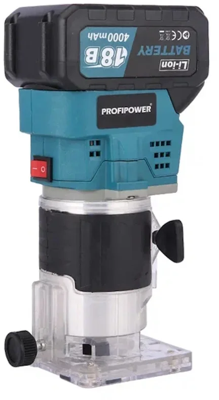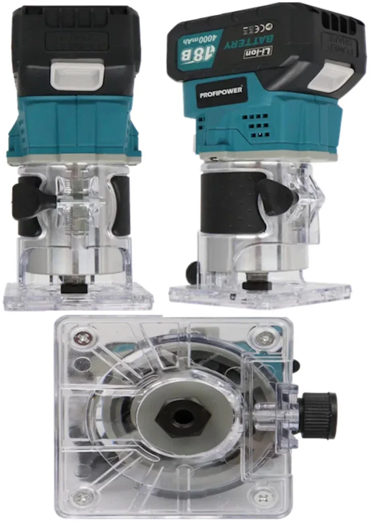- Аккумуляторный фрезер PROFIPOWER MKDRT-18V артикул E0088 с бесщеточным двигателем со скоростью вращения 30000 об/мин, предназначен для фрезерования и профилирования древесины.