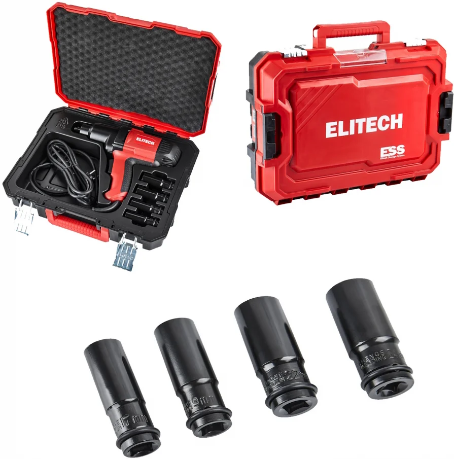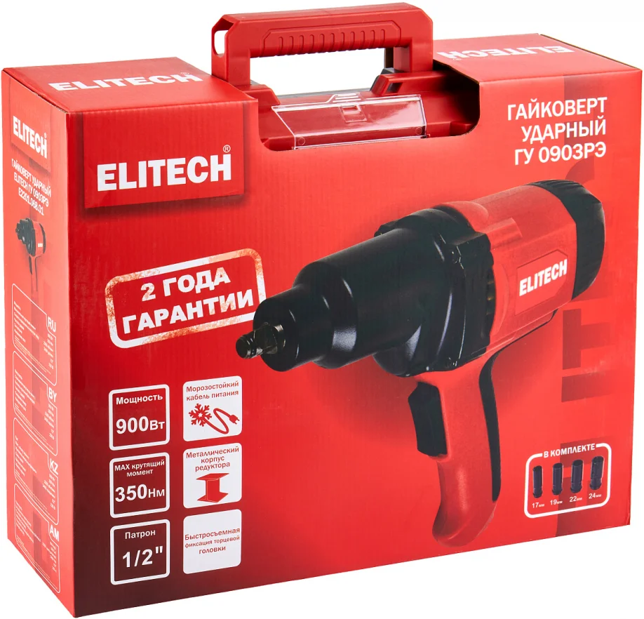 - Ударный гайковерт ELITECH ГУ 0903РЭ (E2201.068.01), артикул 207349 мощностью 900 Вт с частотой 3400 уд/мин и с посадочным квадратом под оснастку (торцевые головки и др.) 1/2’’DR, предназначен для работы с резьбовым крепежом с использованием тангенциального удара для получения высокого крутящего момента до 350 Нм.