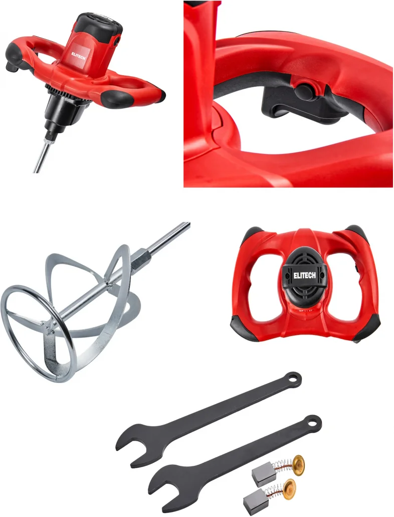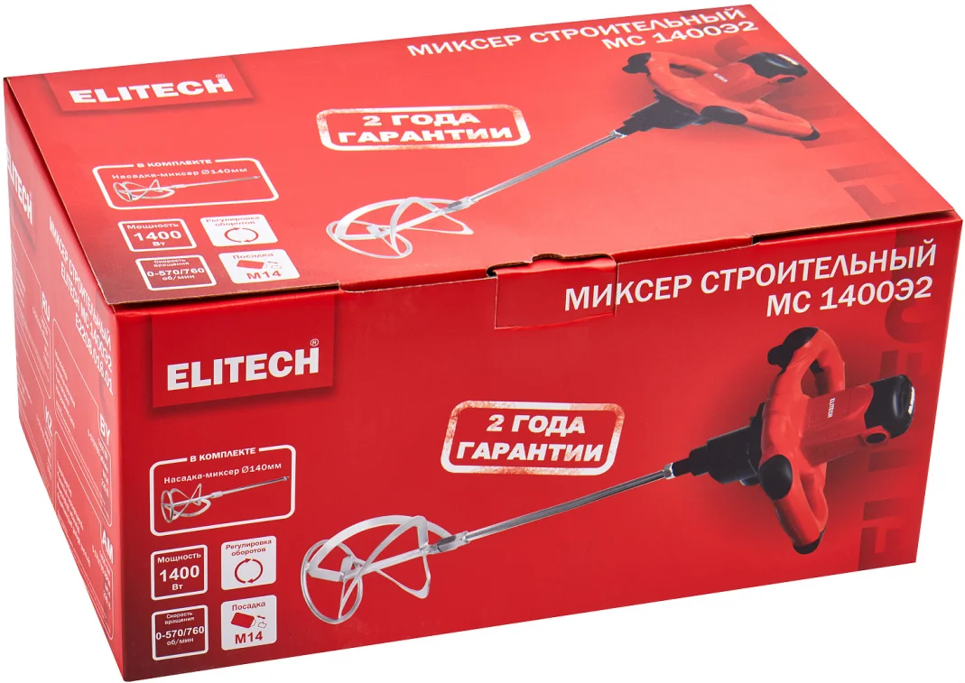 - Строительный миксер Elitech МС 1400Э2 (E2208.016.01), артикул 207352 с двумя скоростями до 760 об/мин и мощностью 1400 Вт предназначен для перемешивания строительных и отделочных материалов двумя мешалками, таких как бетон, раствор, штукатурка, краска, клеи и др.