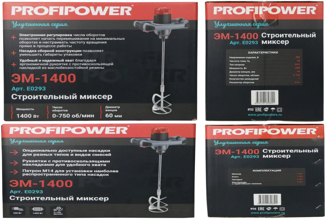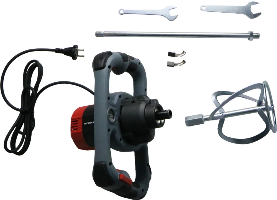 - Строительный миксер PROFIPOWER ЭМ-1400, артикул E0293 с двумя скоростями до 750 об/мин и мощностью 1400 Вт предназначен для перемешивания строительных и отделочных материалов двумя мешалками, таких как бетон, раствор, штукатурка, краска, клеи и др.