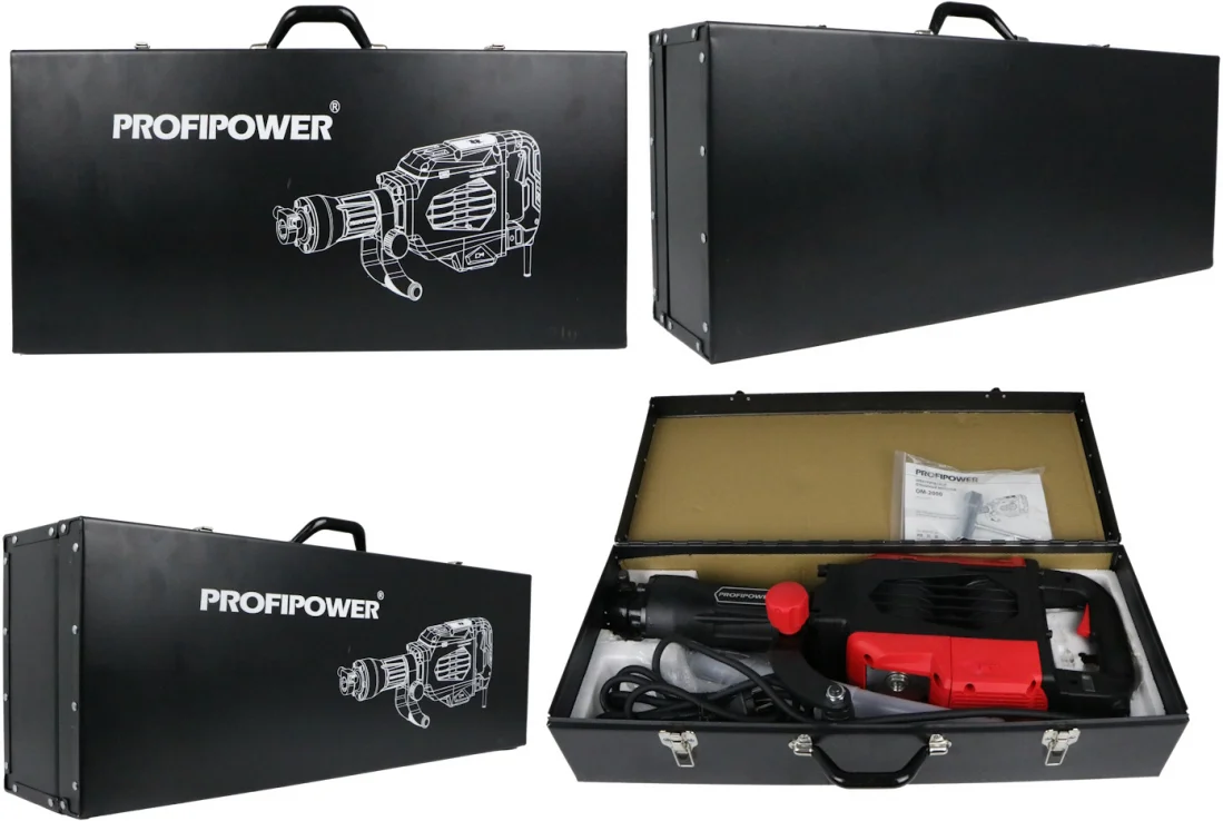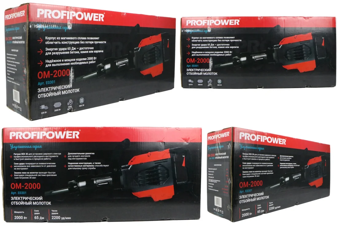 - Отбойный молоток PROFIPOWER ОМ-2000 артикул E0301 мощностью 2000 Вт, частотой ударов 2200 уд/мин и энергией удара 65 Дж предназначен для дробления и раскалывания твердых материалов (бетон, дорожные покрытия, кирпич, штукатурка, природный и искусственный камень), штробления пазов и каналов, проделывания проемов в стенах из кирпича и бетона и других строительно-монтажных работ с использованием соответствующей оснастки.