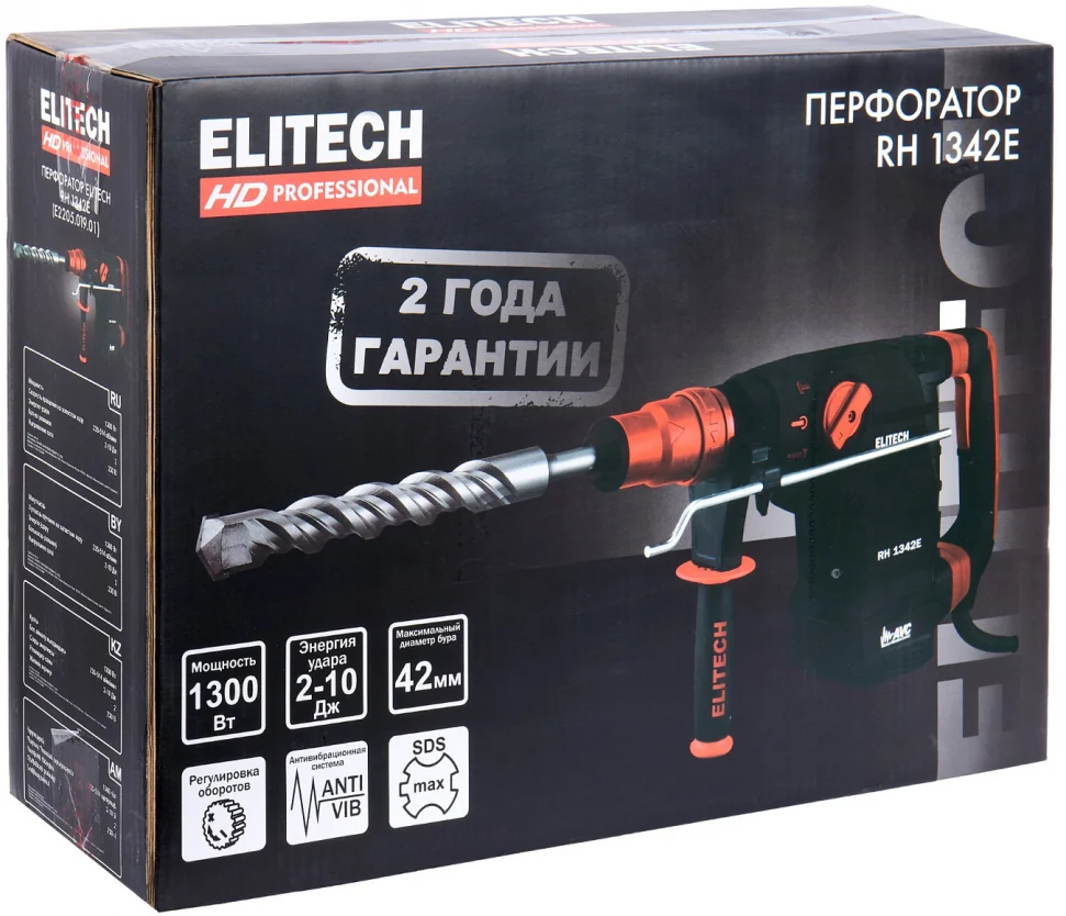 Перфоратор RH 1342Е (E2205.019.01). Тип патрона SDS-max. Мощность 1300Вт. Количество режимов 2 (сверление с ударом, отбойный молоток). Регулировка положения зубила (12 положений). Регулировка оборотов двигателя. Энергия удара 2-10Дж. Предназначен для работы с буром, диаметром до 42мм и коронкой, диаметром до 90мм. Вертикальное расположение двигателя. Антивибрационная система. Индикатор износа щеток двигателя. Индикатор включения в сеть.