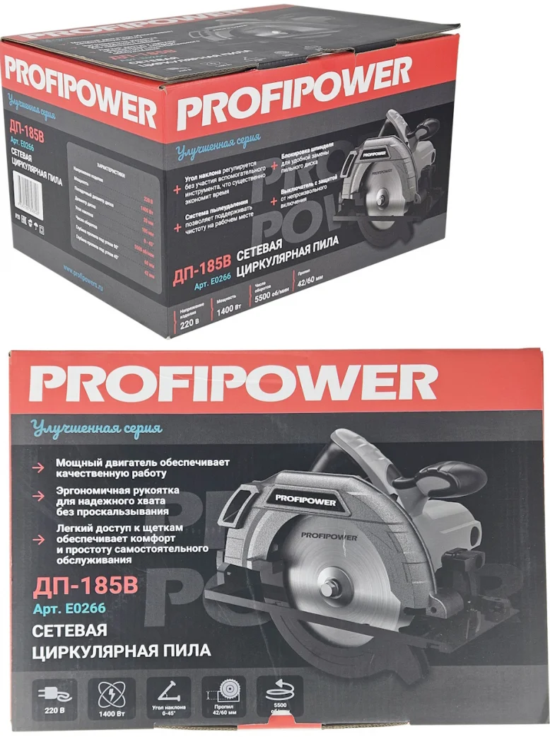 - Пила циркулярная сетевая Profipower ДП-185B артикул E0266 мощность 1400 Вт с удобным управлением подходит для выполнения прямых пропилов в толстой древесине мягких и твердых пород.