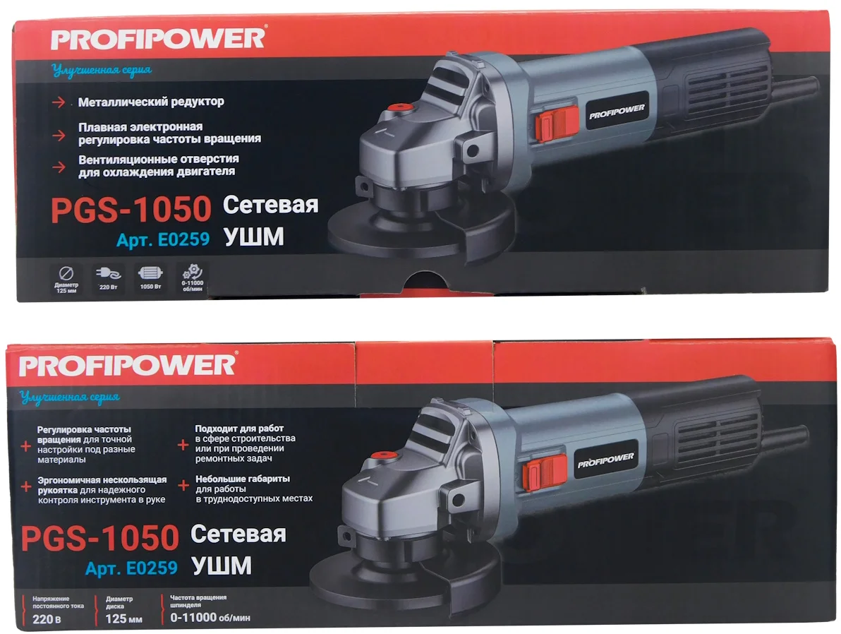 - Сетевая УШМ (болгарка) Profipower PGS-1050R артикул E0259 отлично подходит для работ в сфере строительства или при проведении ремонтных задач.