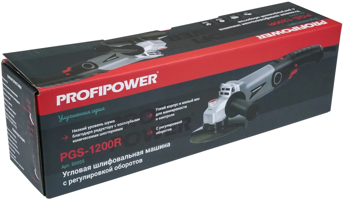 - Сетевая УШМ (болгарка) Profipower PGS-1200R артикул E0005 предназначена для решения самых разных задач по резке, шлифовке, крацеванию и обработки поверхностей металла и камня.