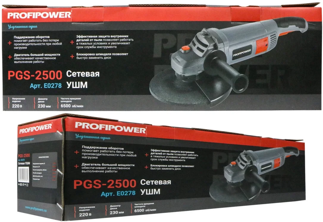 - Сетевая УШМ (болгарка) Profipower PGS-2500 артикул E0278 мощностью 2500 Вт., предназначена для решения самых разных задач по резке, шлифовке, крацеванию и обработки поверхностей металла и камня.