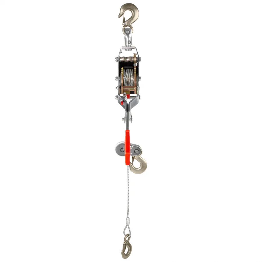 - Безопасная работа — прочный стальной трос диаметром 6 мм не рвется под нагрузкой (при соблюдении условий эксплуатации), а стопорный механизм не допускает падения груза.