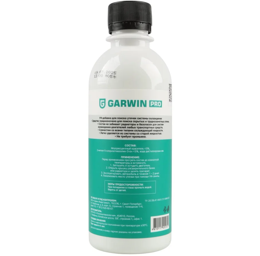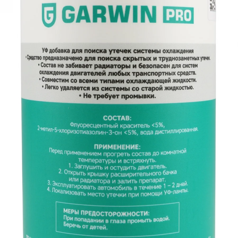УФ добавка для поиска утечек системы охлаждения предназначена для поиска скрытых и труднозаметных утечек. Состав не забивает радиаторы и безопасен для систем охлаждения двигателей любых транспортных средств. Совместим со всеми типами охлаждающей жидкости. Легко удаляется из системы со старой жидкостью и не требует промывки.