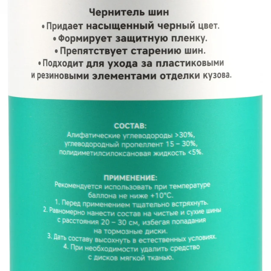 Чернитель шин придает насыщенный черный цвет. Формирует защитную пленку. Препятствует старению шин. Подходит для ухода за пластиковыми и резиновыми элементами кузова.