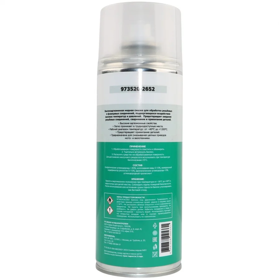 Медная смазка GARWIN PRO 973520-2650 — профессиональная смазка с медным наполнителем в аэрозольной упаковке 520 мл. Используется для защиты и облегчения монтажа/демонтажа резьбовых соединений, подшипников и других высоконагруженных узлов при экстремальных температурах до 1000°C.