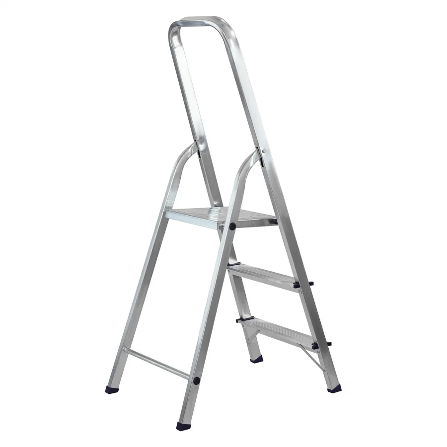 - Надежность — рама из прямоугольного алюминиевого профиля выдерживает нагрузку до 150 кг, широкие ступени закреплены заклепками.