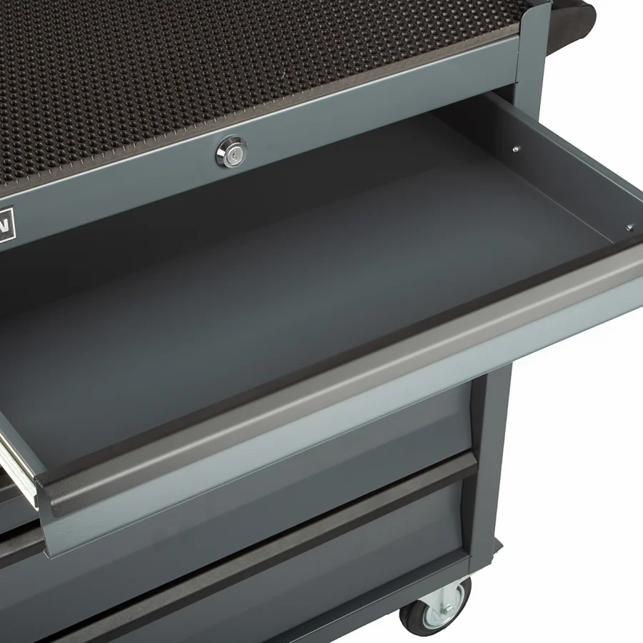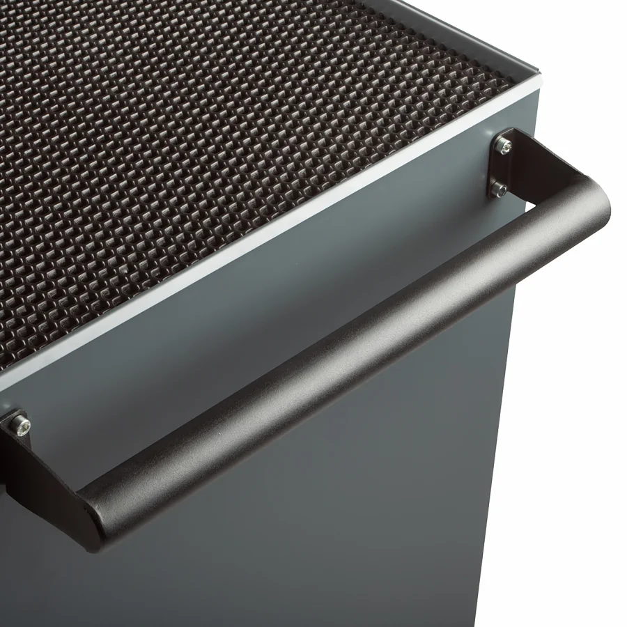 Порошковый метод окраски обеспечивает надёжную защиту от механических воздействий и коррозии. Покрытие не скалывается при ударах, имеет высокую устойчивость к воздействию влаги и перепадам температур. Все ручки имеют износостойкое покрытие "soft-touch" с шероховатой структурой. Благодаря ему тележку комфортно катить, а ящики удобно открывать даже руками в испачканных перчатках.
