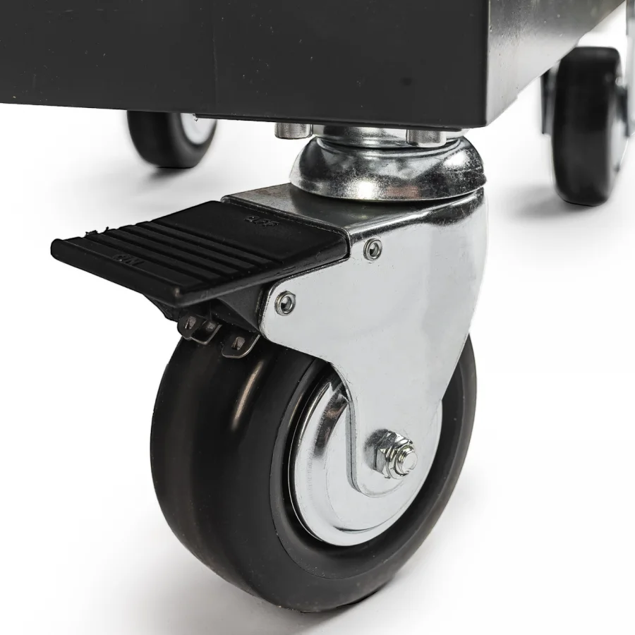 Выдвижные ящики разного размера для организации инструмента по категориям. Максимальная нагрузка — 550 кг, подходит для тяжёлого оборудования и оснастки. Увеличенные колёса Ø125 мм обеспечивают плавное перемещение даже по неровному полу. Функция блокировки колёс предотвращает самопроизвольное движение тележки при работе.
