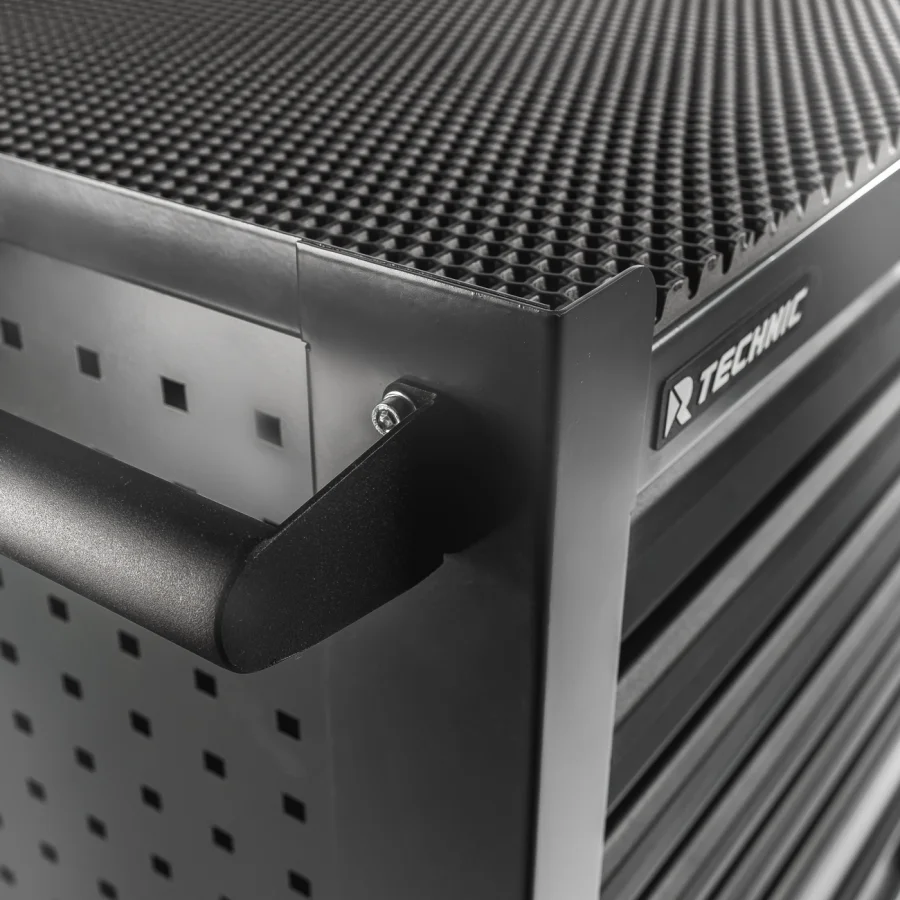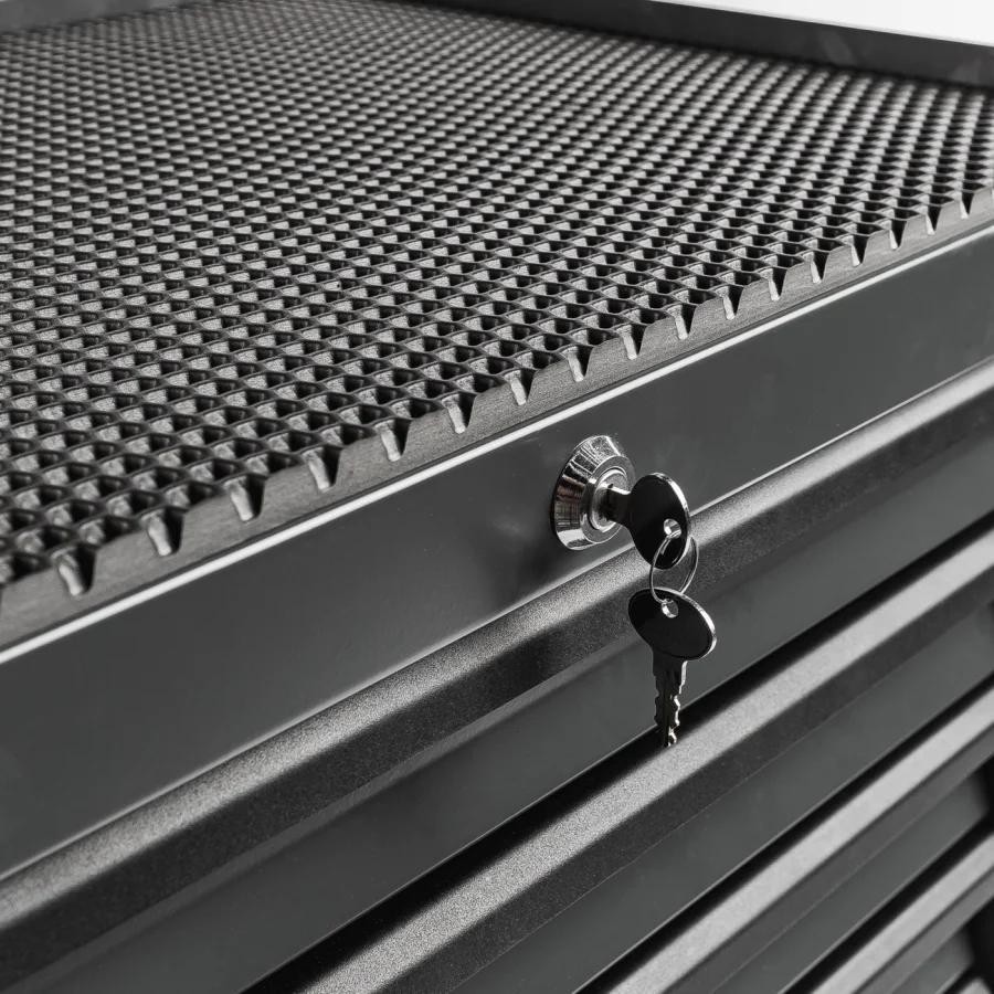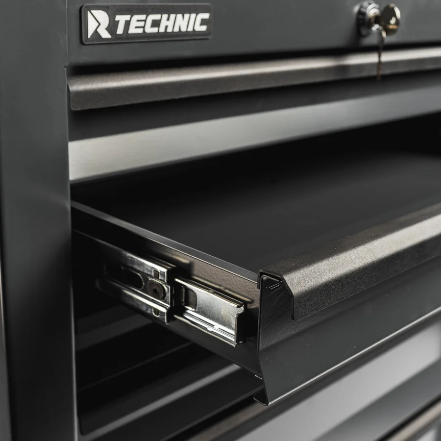 Телескопические направляющие с доводчиками обеспечивают лёгкое и бесшумное выдвижение ящиков с полной выкаткой. Текстурные ручки ящиков для удобного использования в перчатках. Центральный замок для защиты содержимого от несанкционированного доступа. Толщина металла — 1.2 мм, что гарантирует прочность конструкции и долговечность в условиях интенсивной эксплуатации.