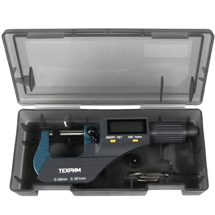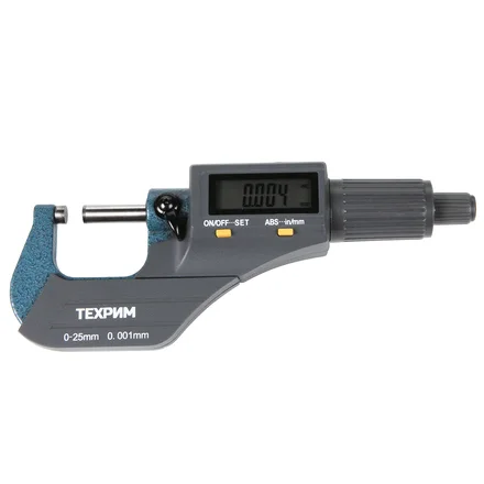 Микрометр гладкий цифровой для наружных измерений ТЕХРИМ T050011 - универсальный прибор для измерений линейных размеров абсолютным или относительным контактным методом с низкой погрешностью в области малых размеров. Преобразовательным механизмом является микропара “винт - гайка”.