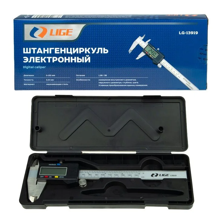 "ШТАНГЕНЦИРКУЛЬ ЭЛЕКТРОННЫЙ Диапазон: 0-150 мм Точность: 0,01 мм Материал: нержавеющая сталь Рабочее питание: батарейка-таблетка 1,5 В/3 В Измерение внутреннего диаметра, наружного диаметра, глубины, шага. Оснащен клавишей преобразования метрических/имперских единиц, нажмите ее, чтобы преобразовать значение из мм в дюймы"