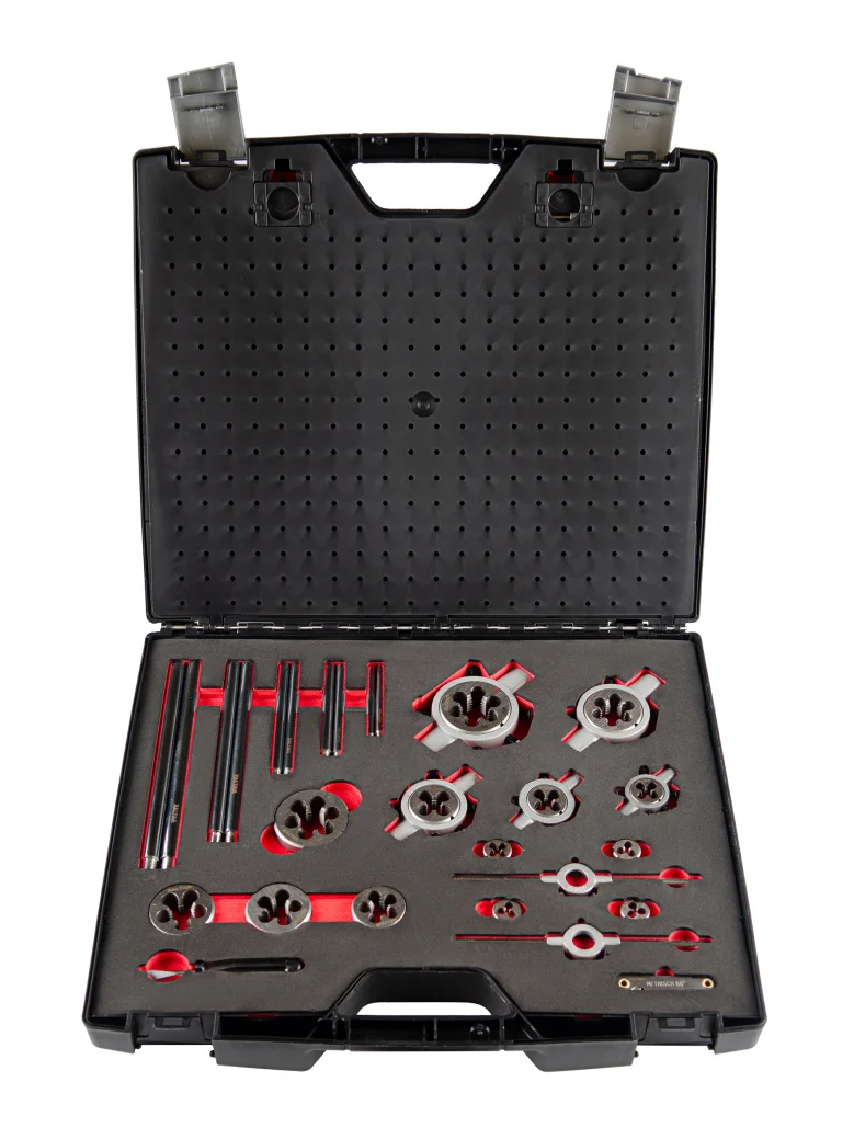 35 плашек: М2x0,4; М3x0,5; М4x0,7; М5x0,8; М6x0,75; М6x1,0; М7x0,75; М7x1,0; М8x0,75; М8x1,0; М8x1,25; М9x0,75; М9x1,0; М9x1,25; М10x0,75; М10x1,0; М10x1,25; М10x1,5; М11x0,75; М11x1,0; М11x1,25; М11x1,5; М12x0,75; М12x1,0; М12x1,25; М12x1,5; М12x1,75; М14x1,0; М14x1,25; М14x1,5; М14x2,0; М16x1,0; М16x1,5; М16x2,0; М18x1,5