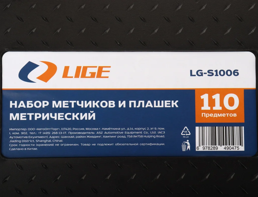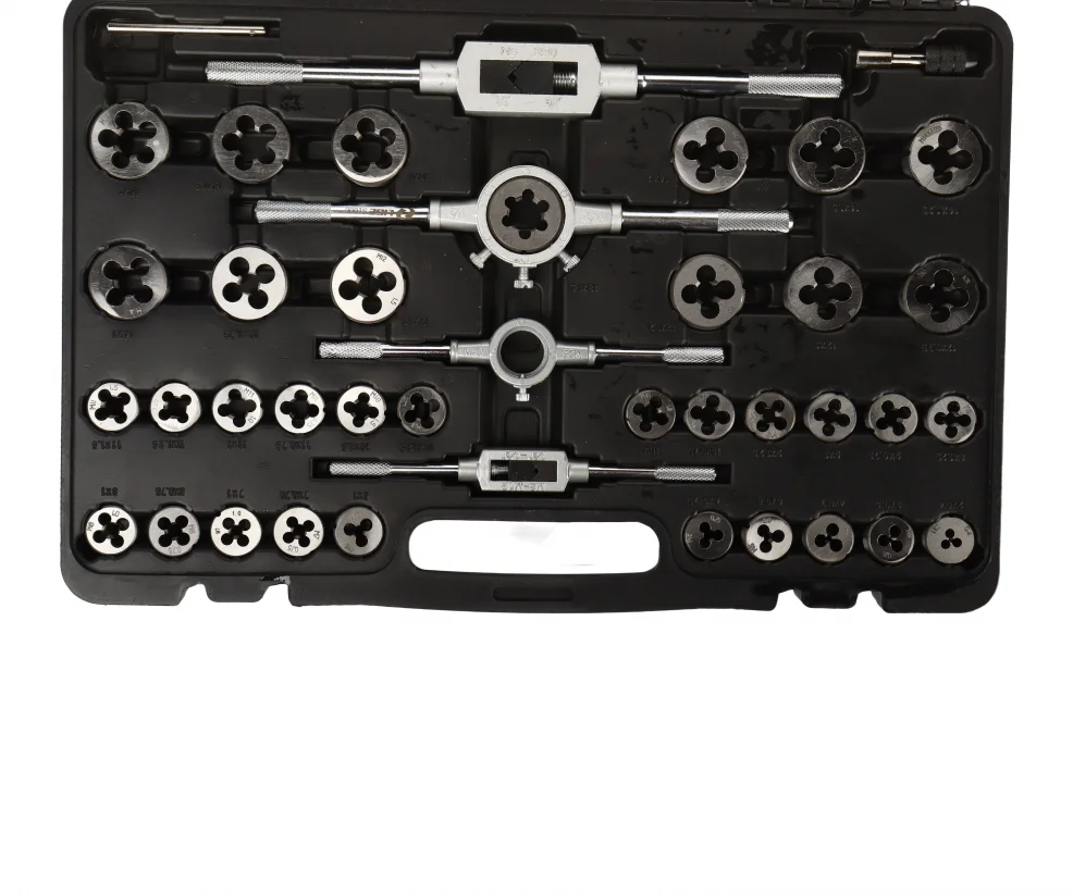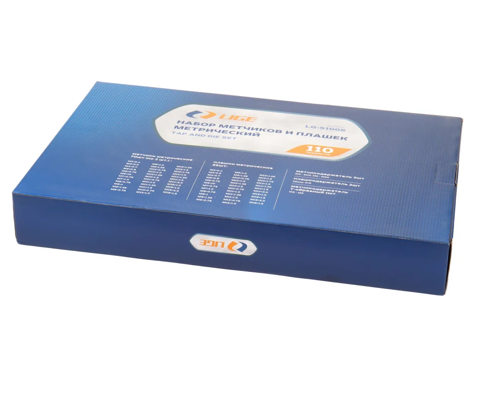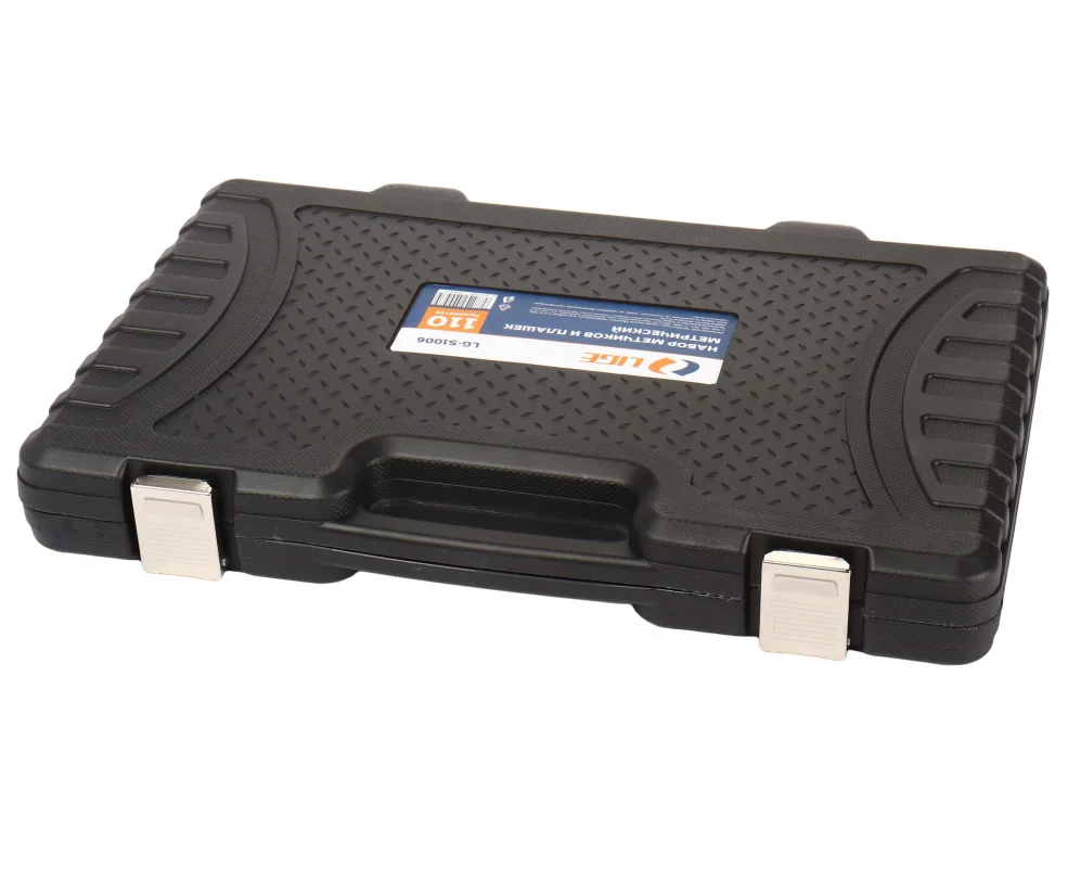 Cостав:70 - метчиков (по 2 шт.) M2X0.4, M3X0.5, M4X0.7, M5X0.8, M6X0.75, M6X10, M7X0.75, M7X1 .0, M8X0.75, M8X1, M8X1.25, M9X0.75, M9X1.0, M9X1.25, M10X0.75, M10X1.0, M10X1.25, M10X1.5, M1 1X0.75, M11X1 .0, M11X1.25M11X1 5, M12X0.75, M12X1.0, M12X1.25, M12X1.5M10X1.75, M14X1.0, M14X1.25, M14X1.5, M1 4X2.0, M16X1.0, M16X1.5, M1 6X2.0, M18X1.5; 35– плашек: M2X0.4, M3X0.5, M4X0.7, M5X0.8, M6X0.75, M6X10, M7X0.75, M7X1 .0, M8X0.75, M8X1, M8X1.25, M9X0.75, M9X1.0, M9X1.25, M10X0.75, M10X1.0, M10X1.25, M10X1.5, M1 1X0.75, M11X1 .0, M11X1.25M11X1 5, M12X0.75, M12X1.0, M12X1.25, M12X1.5M10X1.75, M14X1.0, M14X1.25, M14X1.5, M1 4X2.0, M16X1.0, M16X1.5, M1 6X2.0, M18X1.5; 2 – метчикодержатель: M3 - M12, M6 - M20; 2 – плашкодержатель: 25мм O/D; 1 – метчикодержатель Т-образный: M3 - M6