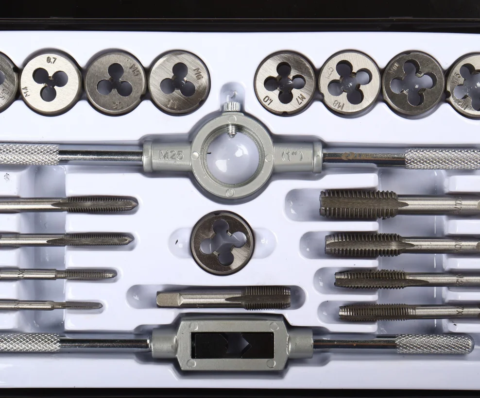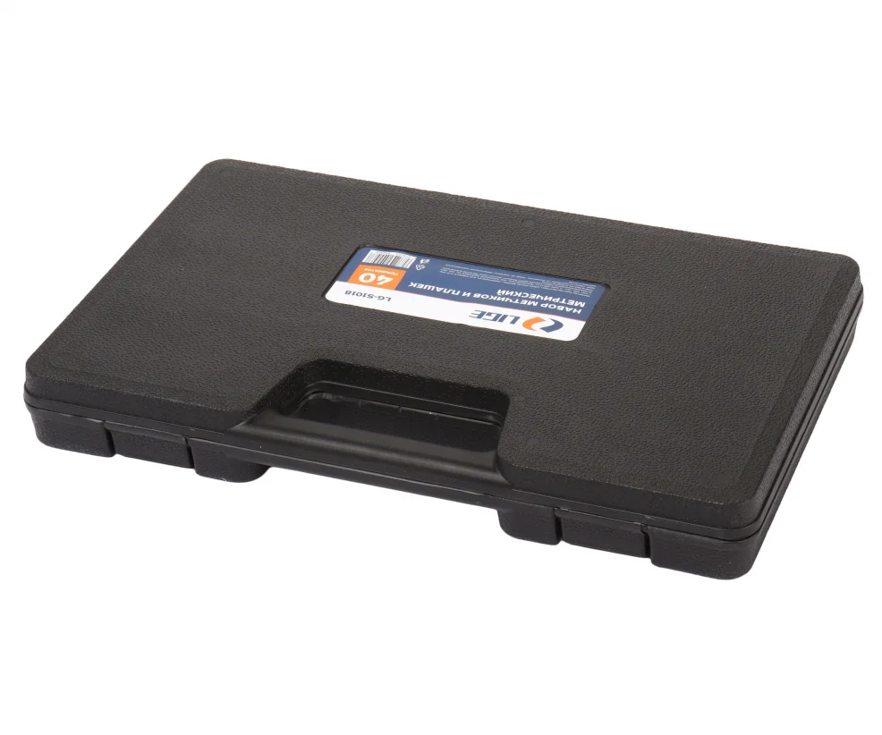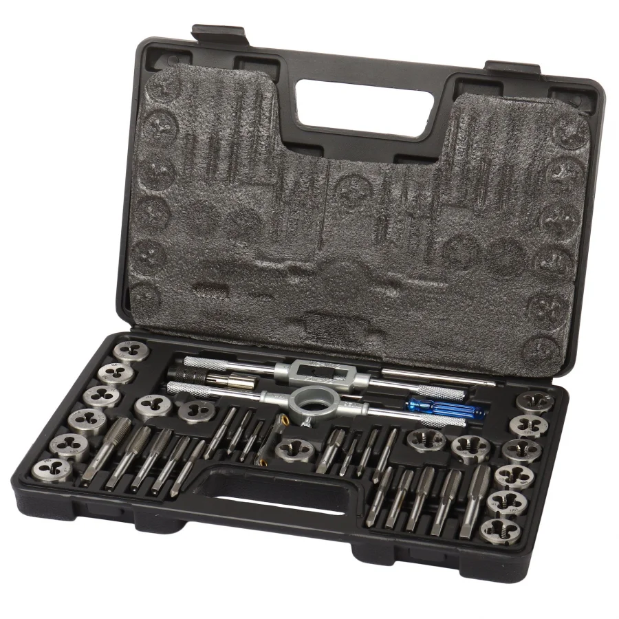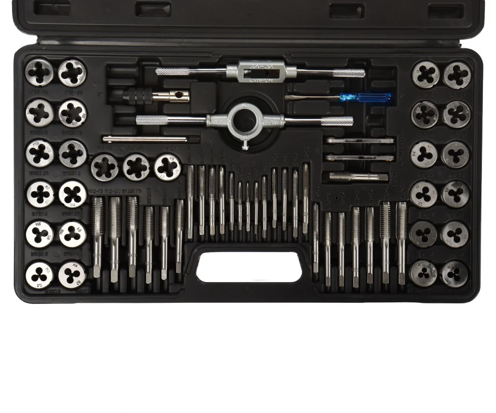 17 Метчиков: 3x0.5, 4x0.7, 5x0.8, 6x1.0, 7x1.0, 8x1.25, 10x1.5, 12x1.75, 1/8NPT27. 3x0.6, 4x0.75, 5x0.9, 6x0.75, 7x0.75, 8x1.0, 10x1.25, 12x1.5. 17 Плашек: 3x0.5, 4x0.7, 5x0.8, 6x1.0, 7x1.0, 8x1.25, 10x1.5, 12x1.75, 1/8NPT27. 3x0,6,4x0,75,5x0,9,6x0,75,7x0,75,8x1,0,10x1,25,12x1,5.. 1 Метчикодержатель: M3-M12, 1 Плашкодержатель: 25 мм O/D, 1 ключ для метчиков T-типа, 1 отвертка, 1 измеритель шага резьбы