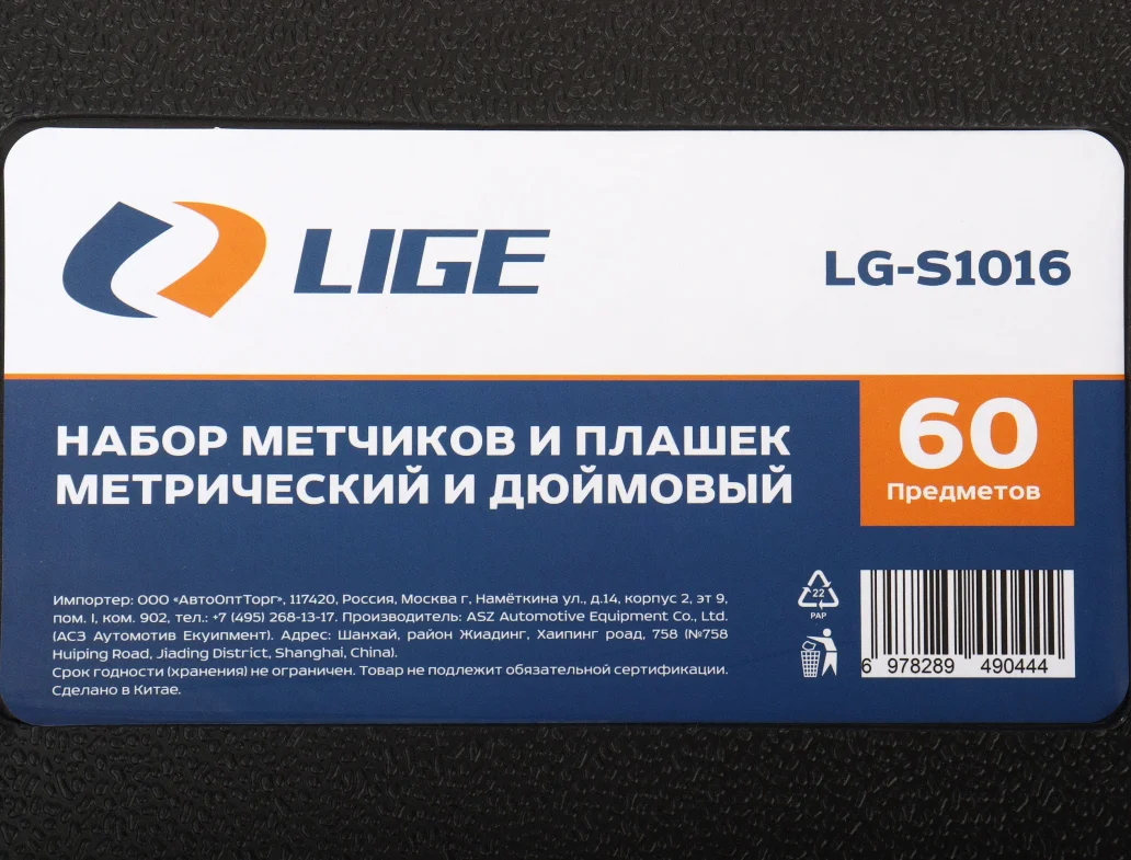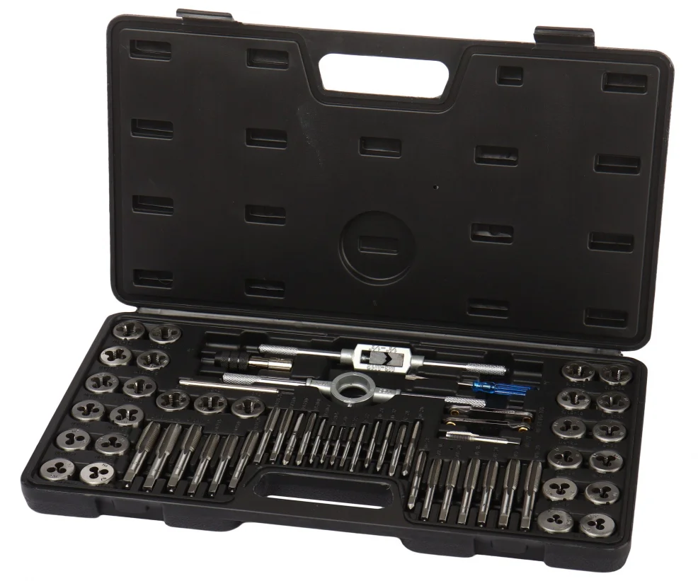 11 Метчиков метрических: 3×0.5; 4×0.7; 5×0.8; 6×1.0; 7×1.0; 8×1.25; 9×1.25; 10×1.0; 10×1.5; 12×1.75; 1/8NPT27 16 Метчиков дюймовых: 4-40; 6-32; 8-32; 10-24; 10-32; 12-24; 1/4-20; 1/4-28; 5/16-18; 5/16-24; 3/8-16; 3/8-24; 7/16-14; 7/16-20; 1/2-13; 1/2-20 11 Плашек метрических: 3×0.5; 4×0.7; 5×0.8; 6×1.0; 7×1.0; 8×1.25; 9×1.25; 10×1.0; 10×1.5; 12×1.75; 1/8NPT27 16 плашек дюймовых: 4-40; 6-32; 8-32; 10-24; 10-32; 12-24; 1/4-20; 1/4-28; 5/16-18; 5/16-24; 3/8-16; 3/8-24; 7/16-14; 7/16-20; 1/2-13; 1/2-20 1 держатель метчика 1 держатель плашки 1 зажим для Т-образного метчика 1 отвертка 2 измеритель шага резьбы