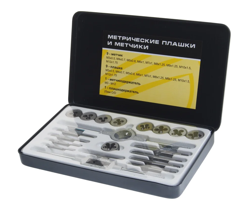 - Плашки М5, М6, М8, М10, М12 (0.8, 1.0, 1.25, 1.5, 1.75);