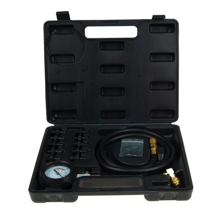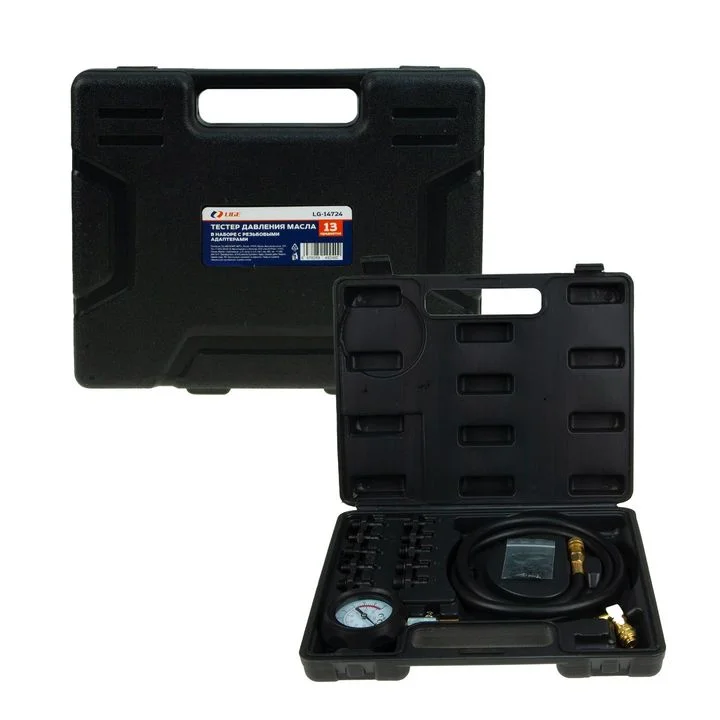 "ТЕСТЕР ДАВЛЕНИЯ МАСЛА В НАБОРЕ С РЕЗЬБОВЫМИ АДАПТЕРАМИ 13ПР Вес: 1.30кг Размер кейса: 325 × 260 × 65мм Давление в шланге: 3000PSI Длина шланга: 120 см Материал фитинга: медь, железо, резина Состав: 10шт: адаптеры (R1/8 DIN2999, 1/8""x27 NPT, 1/4'x18 NPT, 3/8'x20 UNF, 1/2""x20 UNF, M10*1.0, M12*1.5, M14*1.5, M16*1.5, M18*1.5, 90° ELBOW), медные фитинги, манометры"