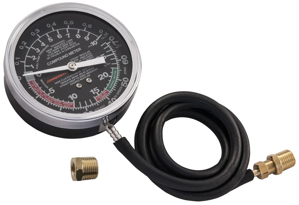 Jonnesway AR020019 Универсальный прибор для измерения давления топливной магистрали и вакуумметр. Профессиональный инструмент для диагностики двигателей с карбюраторной системой. Прибор Jonnesway AR020019 предназначен для измерения давления в топливной магистрали и вакуума в системах автомобилей с бензиновыми двигателями. Используется для проверки работоспособности клапанов ГРМ, вакуумного усилителя тормозов, топливного насоса и диагностики утечек.