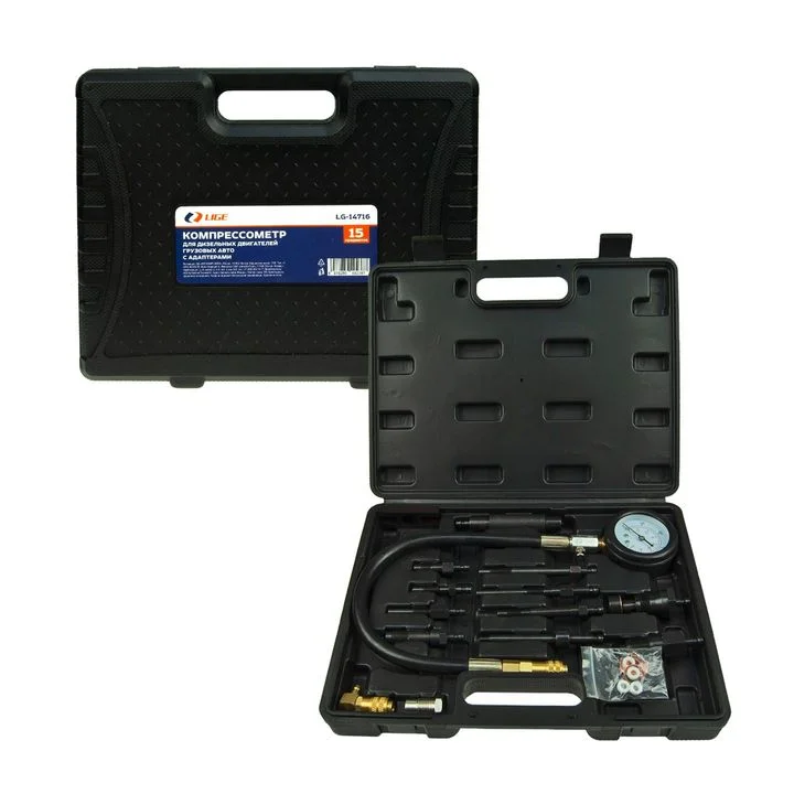 "КОМПРЕССОМЕТР ДЛЯ ДИЗЕЛЬНЫХ ДВИГАТЕЛЕЙ ГРУЗОВЫХ АВТО С АДАПТЕРАМИ 15ПР Вес: 2.10кг Размер кейса: 380 × 275 × 80мм Диапазон манометра: 0-1000 фунтов на квадратный дюйм/0-70 бар Состав: 8 шт.: адаптер для электрической вилки, 6 шт.: адаптер для впрыска масла, 3-дюймовый микрометр, винтовой адаптер (M18x1,5,160 мм) Характеристики адаптера нагревательной свечи: M10X1,91 мм/M10X1,119 мм/M10x1,25,135 мм/M22X1,5,118 мм/M10X1,113 мм/M8X1,102 мм/M10x1,83 мм/M10x1,25,67 мм/M12x1,25,51 мм Характеристики адаптера инжектора: М24x1,5,88 мм/М22x1,5,75 мм/М24x2,63 мм/М20x1,5,75 мм"