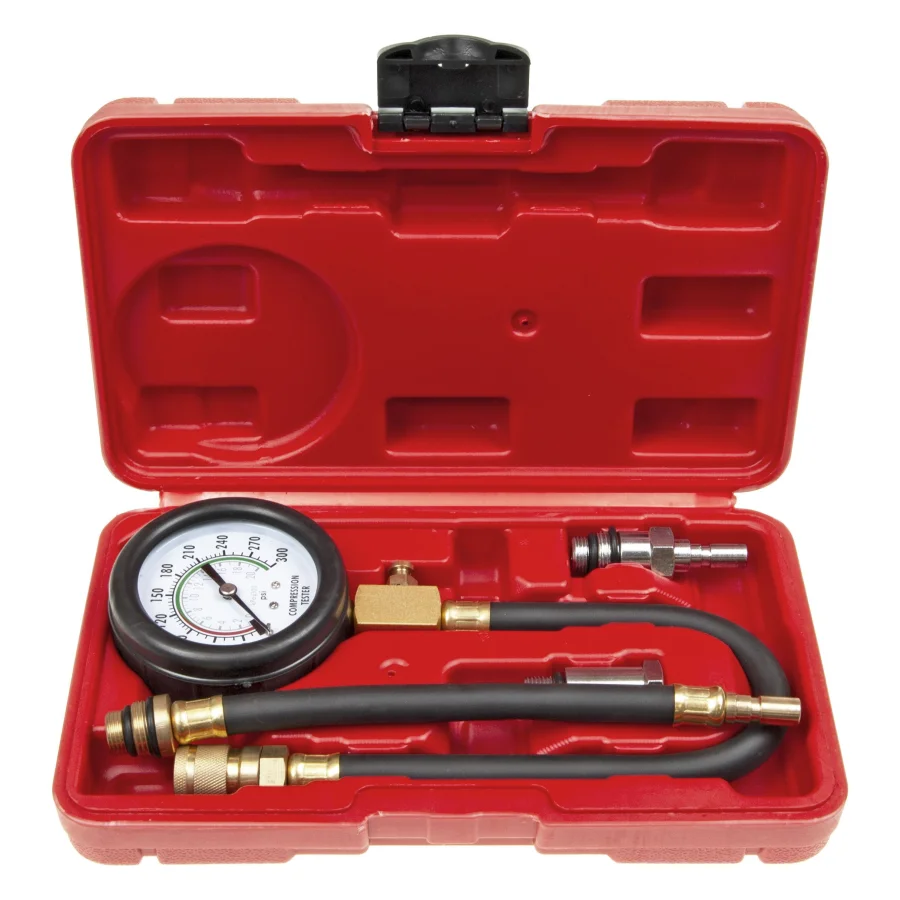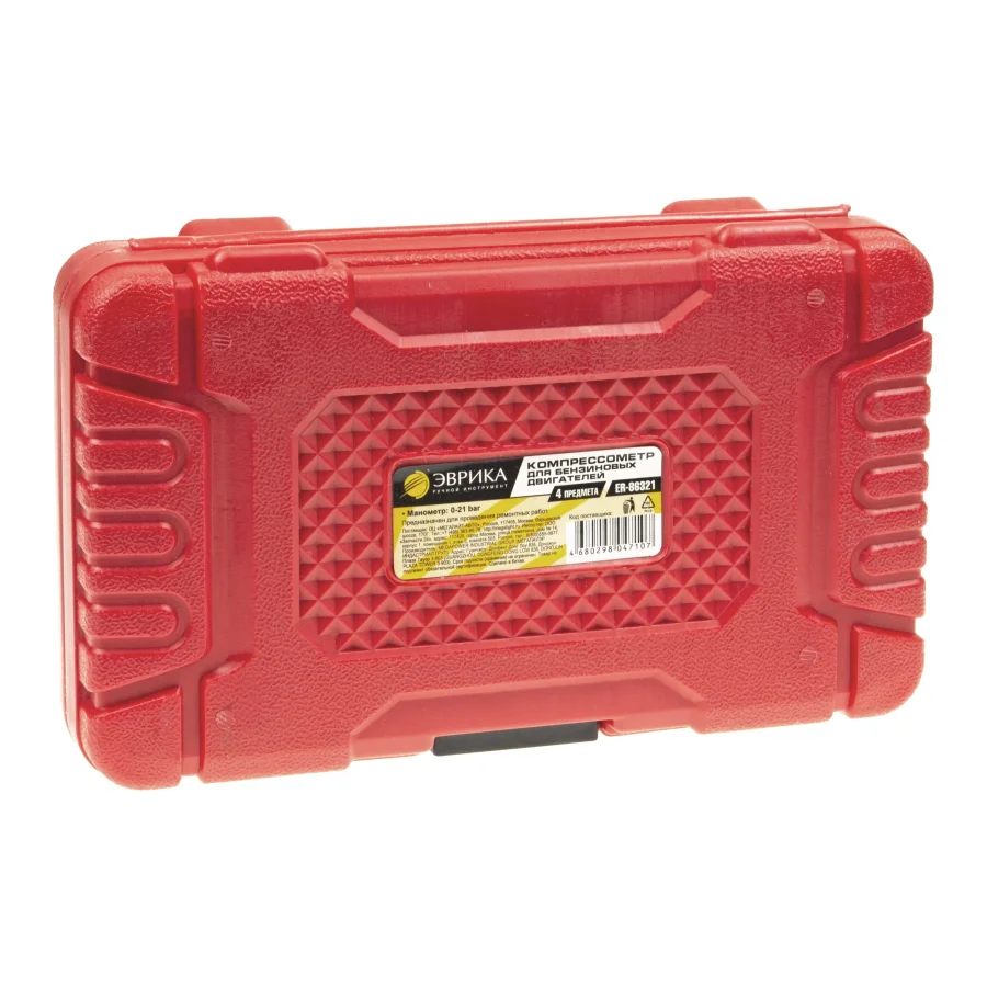 Компрессометр для бензиновых двигателей(0-21bar) 4 пр. в кейсе ЭВРИКА. Прибор для измерения компрессии в бензиновых двигателях автомобилей легковых авто компрессометр 4предметов в чемодане. Применяется для диагностики двигателей, работающих на бензине, позволяет измерить давление в цилиндрах двигателя автомобиля. Этот инструмент относится к категории диагностических инструментов и входит в базовый комплект для работы на станциях технического обслуживания и в автомастерских. С его помощью можно провести анализ и оценку технического состояния двигателя автомобиля даже в условиях гаража. Жесткий прижимной адаптер обеспечивает надежное крепление индикатора на двигателе и предотвращает его смещение во время измерения. Каждый адаптер имеет свою резьбу и подходит только для определенного типа двигателя. Компрессометр бензинового двигателя поставляется в кейсе для удобства хранения и транспортировки. Благодаря своей универсальности, инструмент позволяет одному человеку производить замеры и демонтаж различных компонентов.