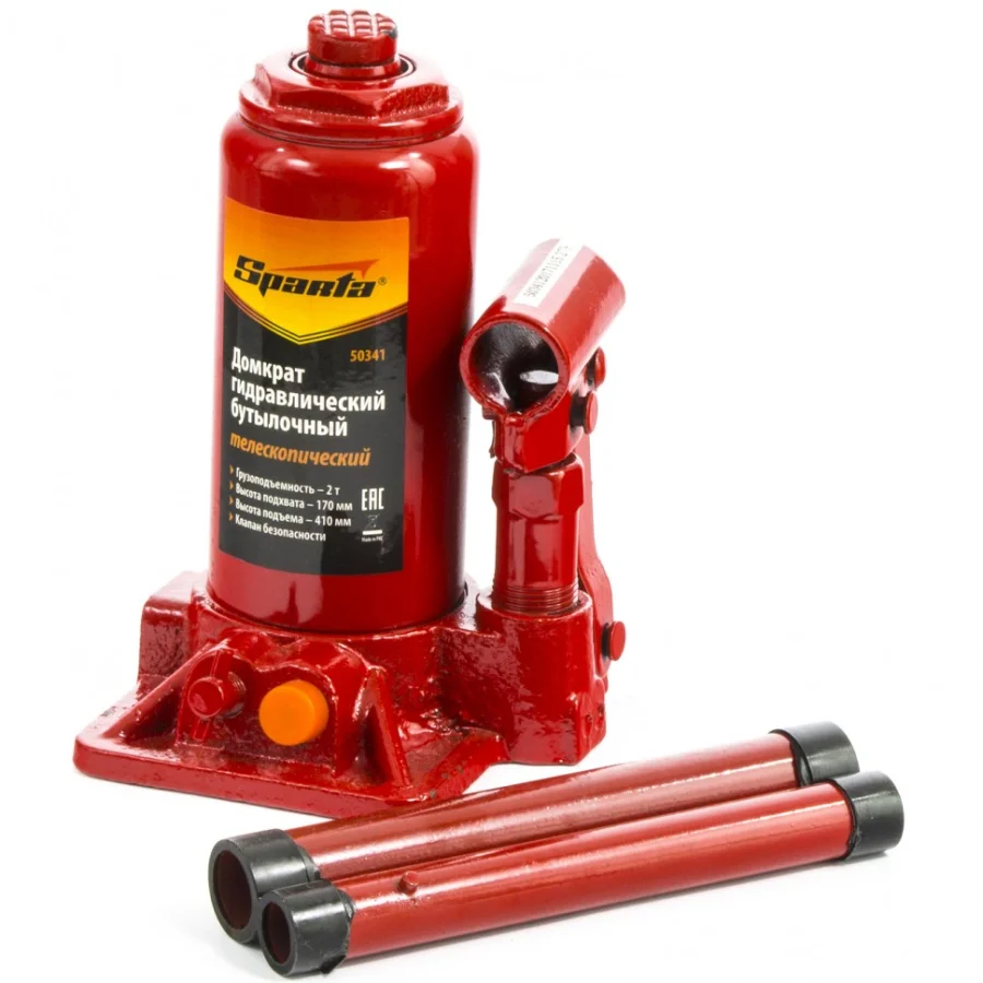 Гидравлический бутылочный телескопический домкрат Sparta 50341 позволяет без особых усилий поднять автомобиль весом до 2 т на высоту 170-410 мм для проведения технического обслуживания. Он пригодится в автосервисе и шиномонтаже, а также будет полезен в гараже и во время поездки.