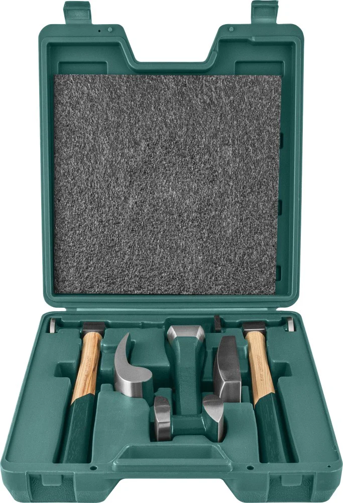Описание Набор поддержек и рихтовочных молотков для жестяных работ, 6 предметов. Все инструменты изготовлены из углеродистой стали, рукоятки молотков – орех (HIKORY). Область применения Небольшая подборка инструмента для несложного кузовного ремонта. Содержание - Молоток рихтовочный финишный прямой. - Молоток рихтовочный стяжной, легкая насечка. - Поддержка «Наковальня» - Изогнутая поддержка «Запятая» - Поддержка «Ложка» - Упорная поддержка