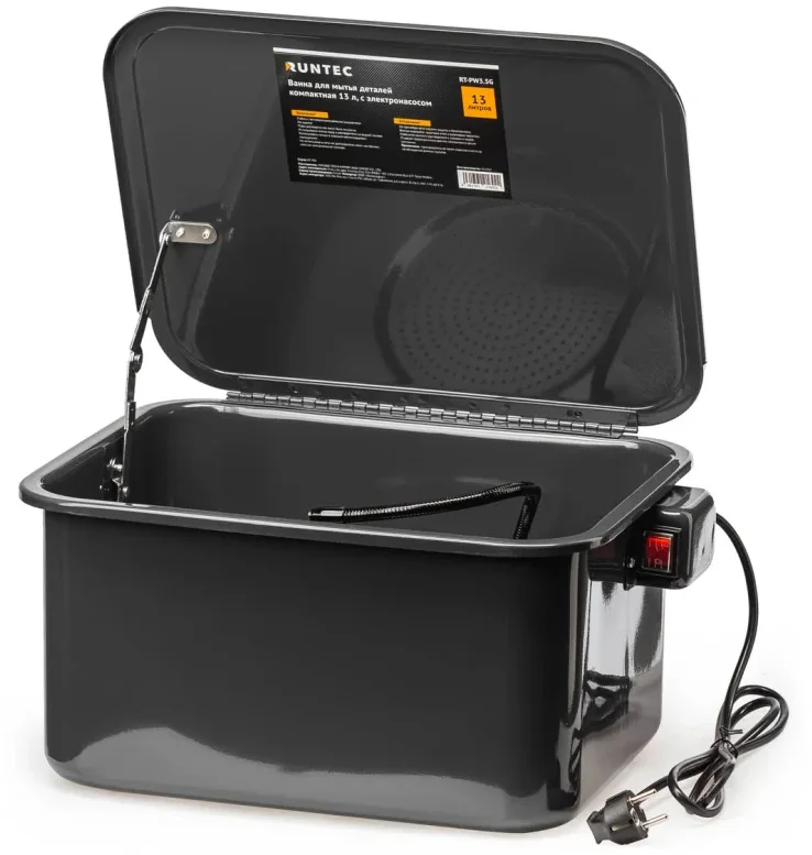 RUNTEC RT‑PW3.5G — компактная ванна для очистки автомобильных и промышленных деталей с электрическим насосом для принудительной циркуляции моющего раствора. Предназначена для ежедневного применения в автомастерских, СТО, гаражах и производственных цехах. Оптимальна для обработки мелких и средних деталей — от крепёжных элементов до узлов агрегатов.