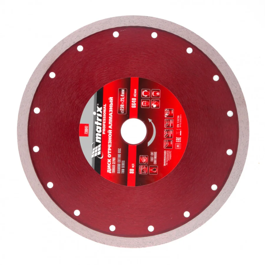 Тонкий сплошной алмазный диск Matrix 230 х 25,4 мм 730847 обеспечивает мокрое резание плотных материалов: керамогранита, керамической и кафельной плитки, мрамора, натурального и искусственного камня. Он устанавливается на УШМ или плиткорезы и используется с применением водяного охлаждения. Диск увеличивает производительность на 20% благодаря небольшой толщине 2,1 мм и снижению нагрузки на инструмент.