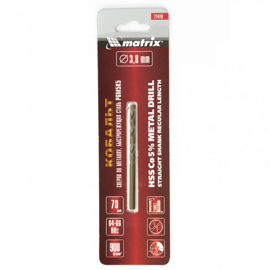 Сверло Matrix 71418 диаметром 3,8 мм, из стали HSS Co-5%, имеет угол заточки 135°, оптимальный для работы с легированными и цветными металлами. Подходит для профессионального использования на строительной площадке.