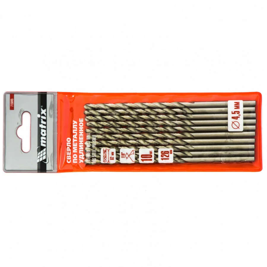 Полированное удлиненное сверло по металлу Matrix 715045 размером 4,5 х 126 мм, из стали HSS, с цилиндрическим хвостовиком, 10 шт. в упаковке, благодаря удлиненному профилю подходит для глубокого сверления. Угол заточки сверл составляет 118° и является оптимальным для работы с черными металлами, сталью, чугуном и твердой бронзой.